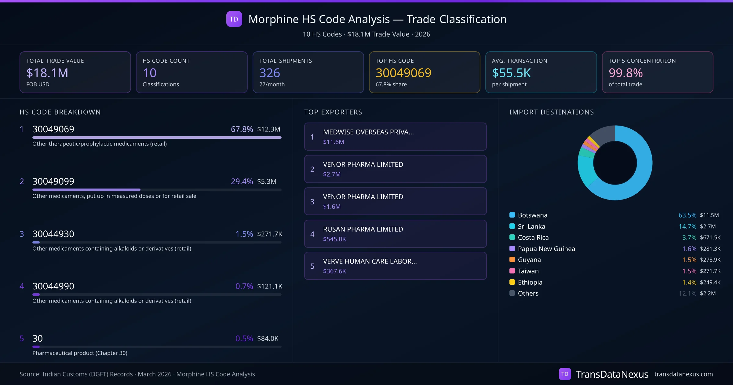 India exports Morphine under 10 distinct HS code classifications, representing a total trade value of $18.1M across 326 shipments. The dominant classification is HS 30049069 (Other therapeutic/prophylactic medicaments (retail)), accounting for 67.8% of all Morphine trade at $12.3M. HS 30049099 (Other medicaments, put up in measured doses or for retail sale) follows at 29.4% ($5.3M). The top 5 HS codes together account for 99.8% of total Morphine trade from India. The average transaction value is $55495. Key importing markets include Botswana, Sri Lanka, Costa Rica. Leading exporters include MEDWISE OVERSEAS PRIVATE LIMITED and VENOR PHARMA LIMITED. Data sourced from Indian Customs (DGFT) shipping bill records.