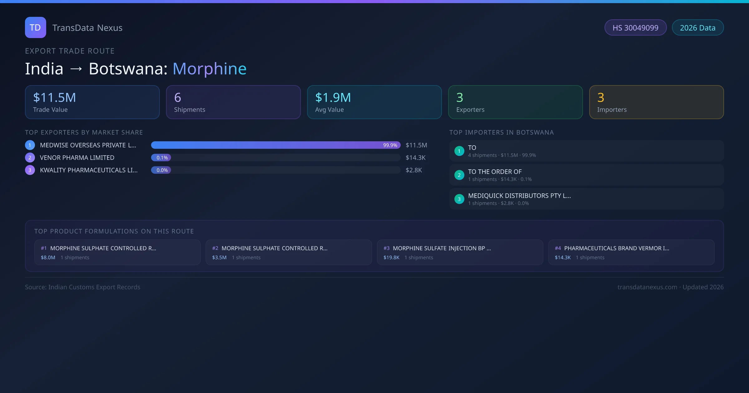 The India to Botswana Morphine corridor is one of India's established pharmaceutical export routes, with 6 shipments documented worth a combined $11.5M USD. The route is dominated by MEDWISE OVERSEAS PRIVATE LIMITED, which alone accounts for roughly 100% of all export value, reflecting the consolidated nature of India's morphine manufacturing sector.