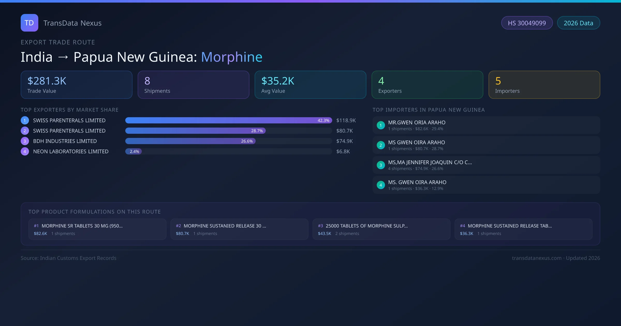 The India to Papua New Guinea Morphine corridor is one of India's established pharmaceutical export routes, with 8 shipments documented worth a combined $281.3K USD. The route is dominated by SWISS PARENTERALS LIMITED , which alone accounts for roughly 42% of all export value, reflecting the consolidated nature of India's morphine manufacturing sector.