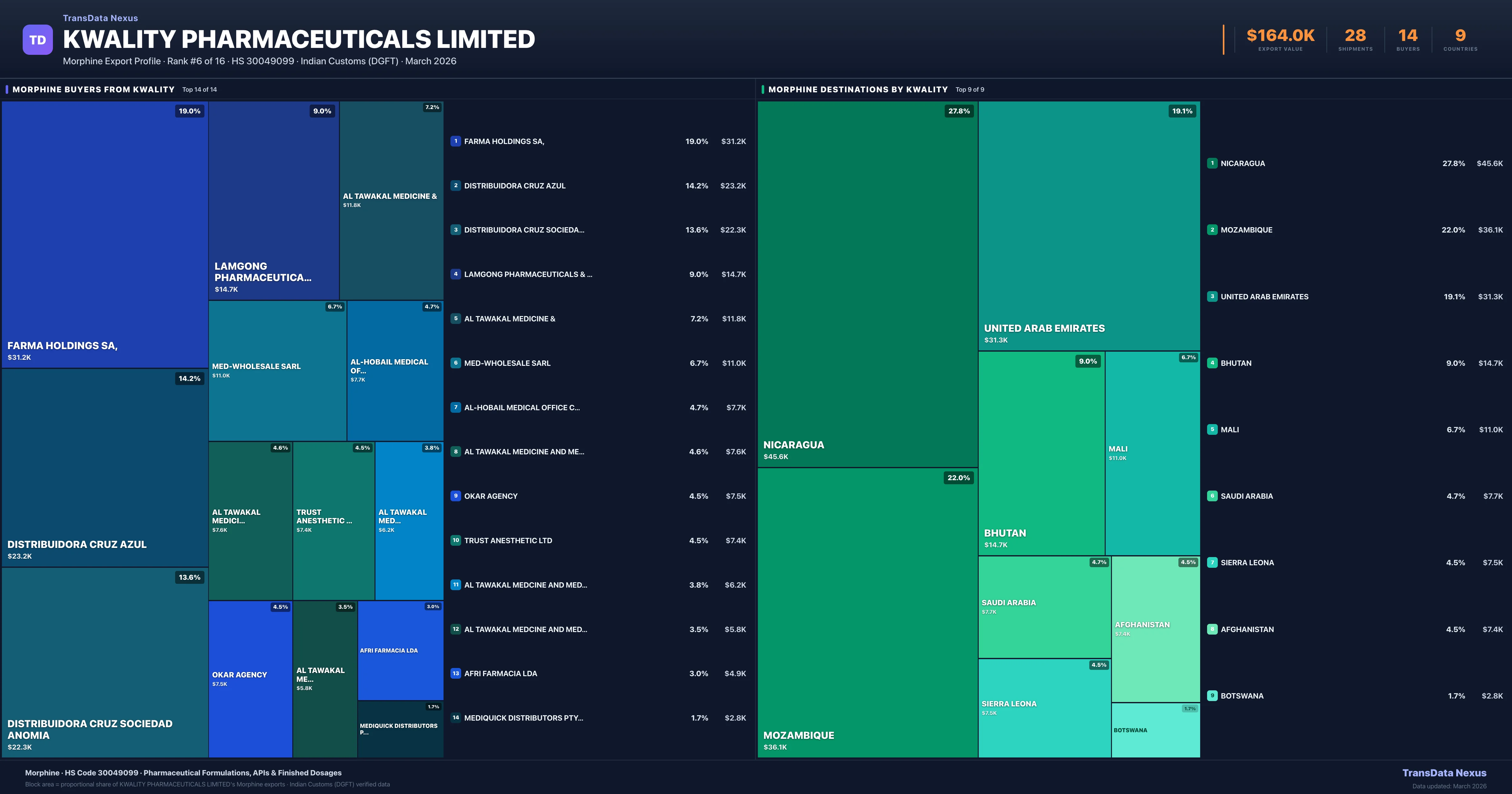 - 4.Verified Records: This page is backed by 28 individual customs records matching Kwality Pharmaceuticals Limited exporting Morphine, covering 20 formulations to 9 countries via 14 buyers.
