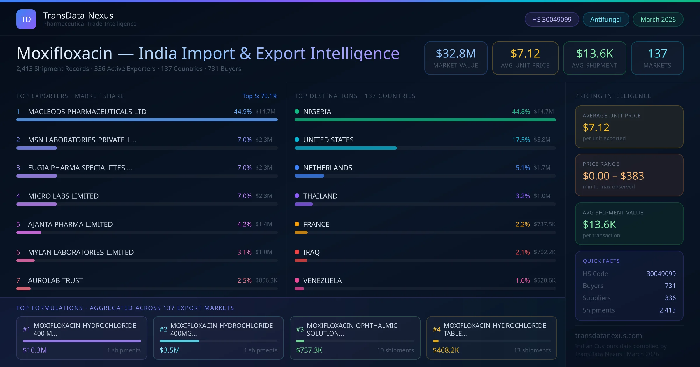 Between 2022 and 2026, India exported $32.8M worth of moxifloxacin across 2,413 verified shipments to 137 countries — covering 70% of world markets in the Advanced Antibiotics segment. The largest destination is NIGERIA (44.8%). MACLEODS PHARMACEUTICALS LTD leads with a 44.9% share. All figures are drawn from Indian Customs (DGFT) shipping bill records spanning four years of trade activity.