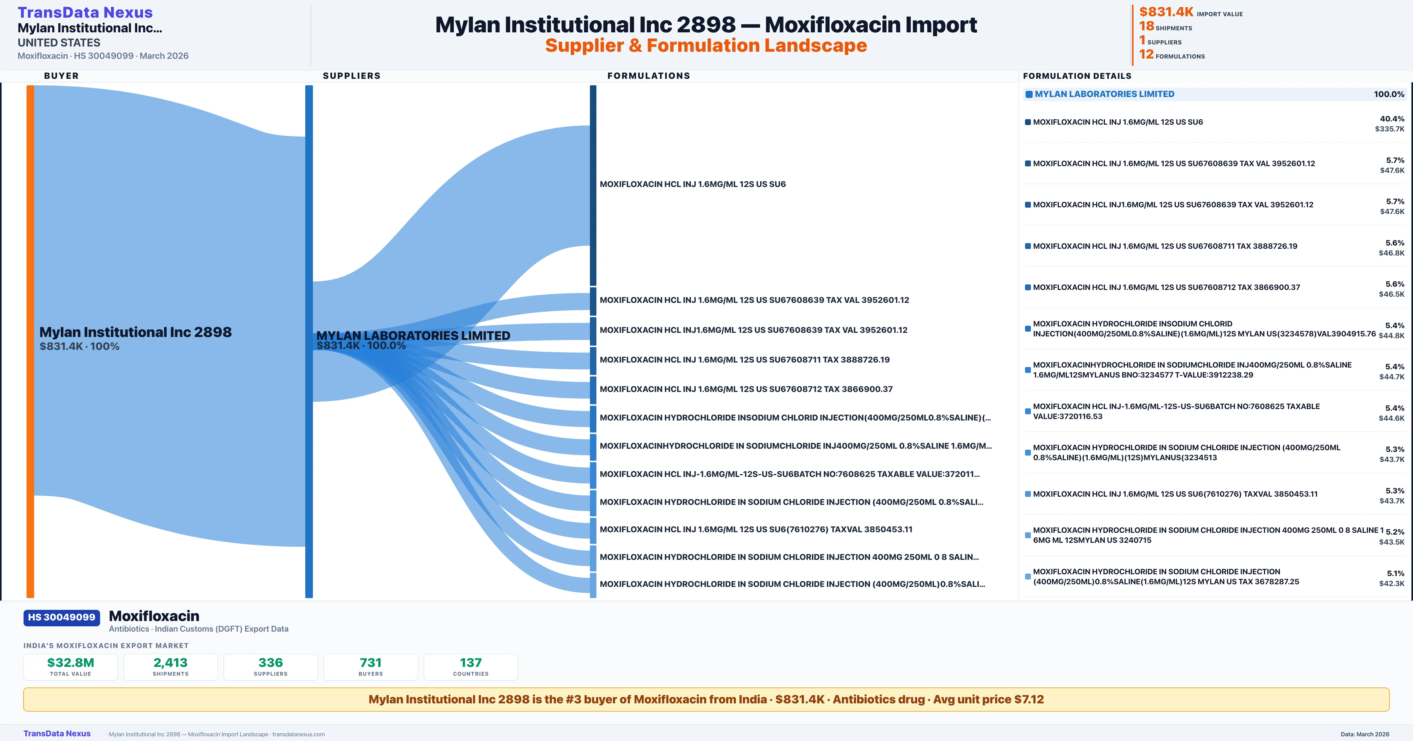 MYLAN INSTITUTIONAL INC 2898 imports 12 distinct Moxifloxacin formulations from India. The top formulation is MOXIFLOXACIN HCL INJ 1.6MG/ML 12S US SU6 with 7 shipments worth $335.7K.