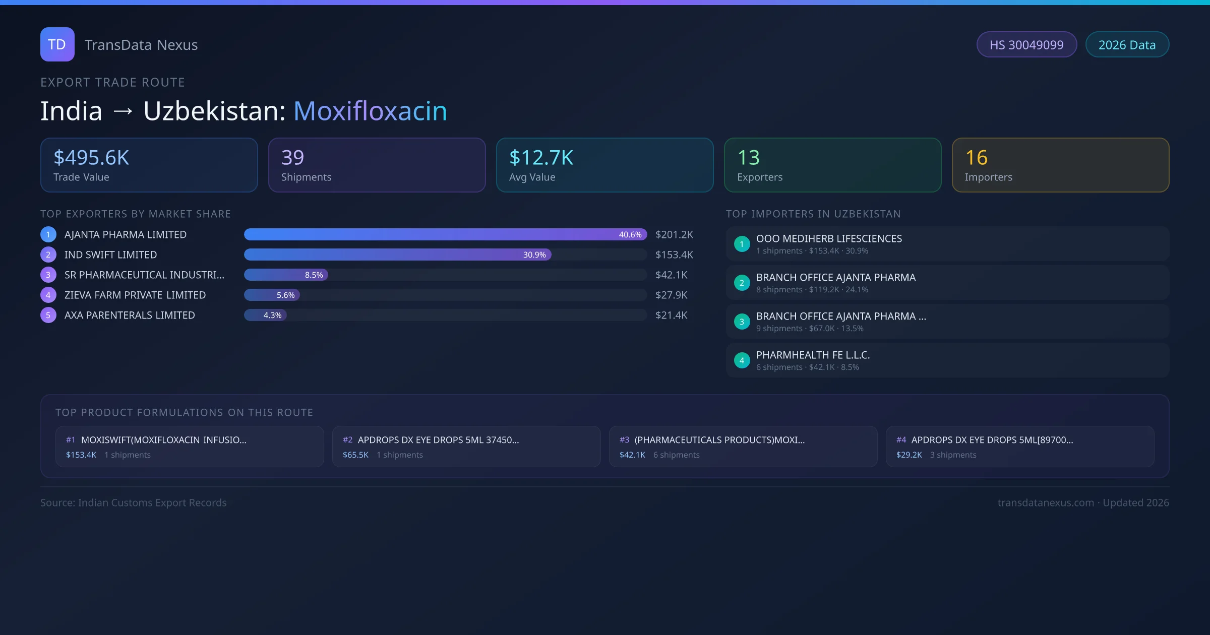 India has recorded 39 verified shipments of Moxifloxacin exported to Uzbekistan, representing a combined trade value of $495.6K USD. This corridor is served by 13 active Indian exporters, with an average shipment value of $12.7K USD. The leading Indian exporter is AJANTA PHARMA LIMITED, which accounts for 41% of total export value with 19 shipments worth $201.2K USD. On the buying side, OOO MEDIHERB LIFESCIENCES is the largest importer in Uzbekistan with $153.4K USD in purchases. The top 3 suppliers — AJANTA PHARMA LIMITED, IND SWIFT LIMITED , SR PHARMACEUTICAL INDUSTRIES PRIVATE LIMITED — together control 80% of total trade value on this route. All data sourced from Indian Customs (DGFT) shipping bill records. Values reported in FOB USD.