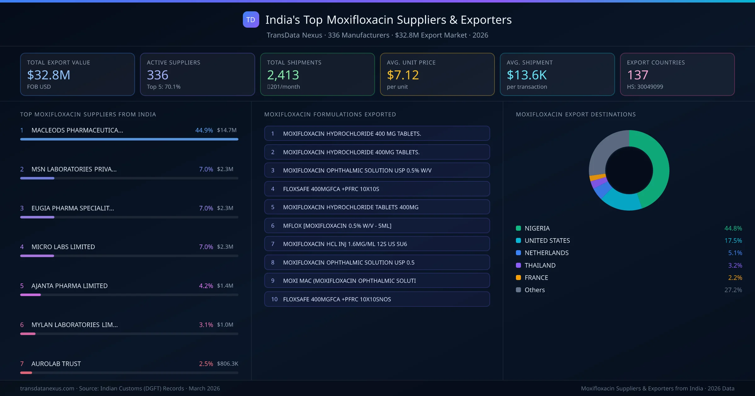 India has 336 active moxifloxacin exporters with a combined export market of $32.8M across 2,413 shipments to 137 countries. The top 5 suppliers hold 70.1% of total export value.