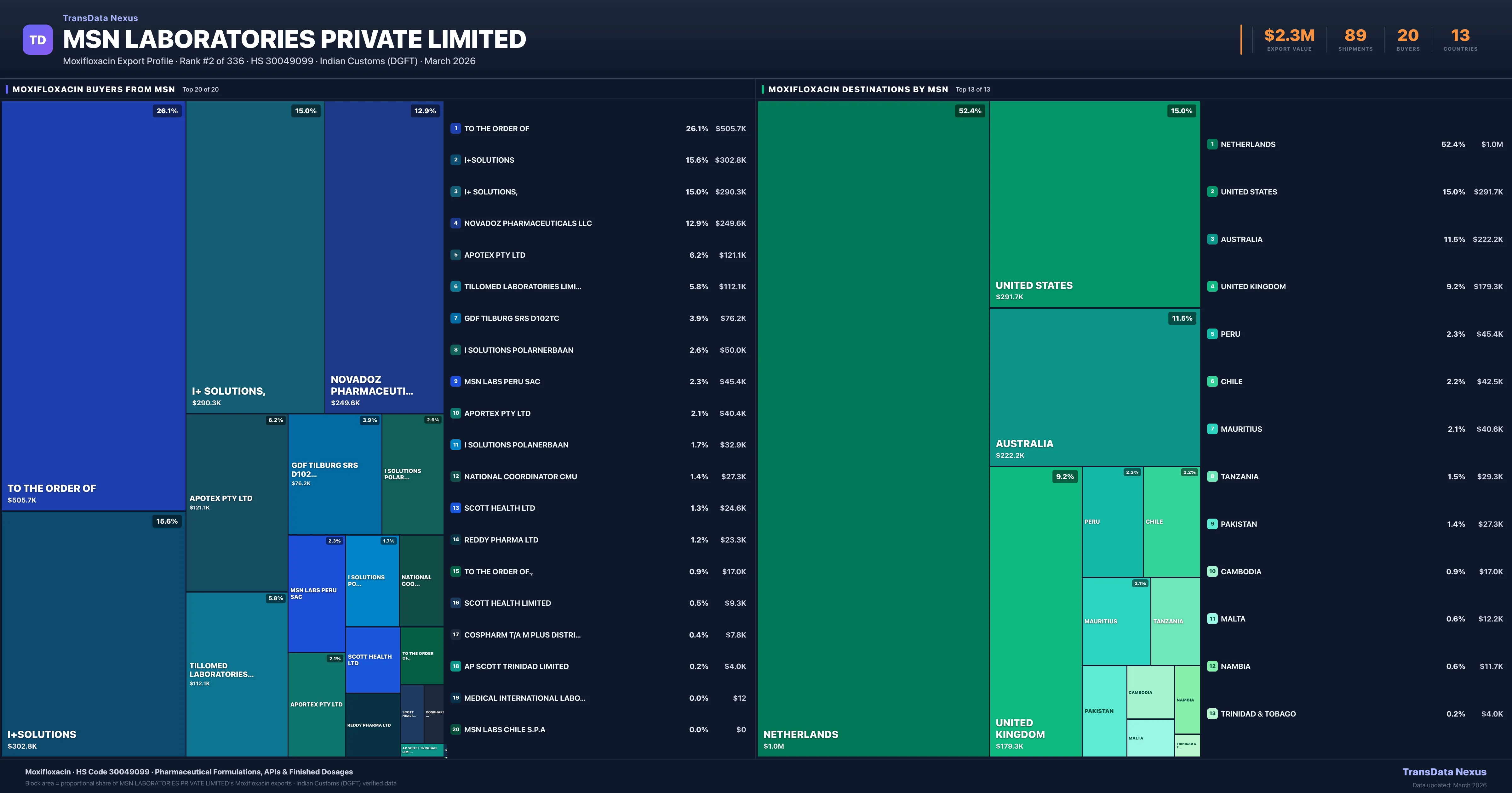 MSN Laboratories Private Limited supplies Moxifloxacin to 20 buyers globally. The largest buyer is TO THE ORDER OF (AUSTRALIA), followed by I+SOLUTIONS (NETHERLANDS) and I+ SOLUTIONS, (NETHERLANDS). These buyers represent pharmaceutical distributors, hospital groups, and government procurement agencies in their respective markets.