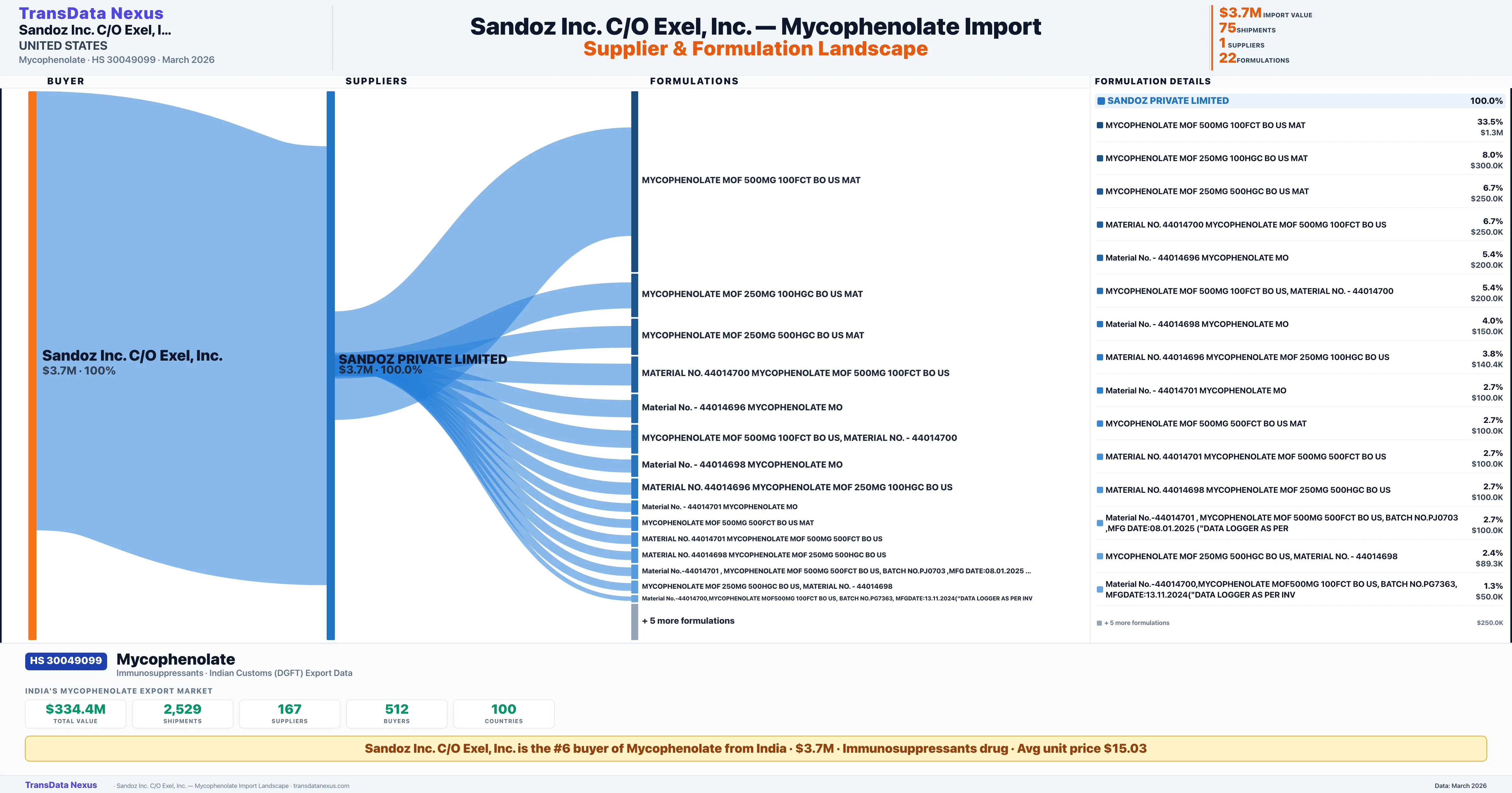 SANDOZ INC. C/O EXEL, INC. sources Mycophenolate from 1 verified Indian supplier: SANDOZ PRIVATE LIMITED ($3.7M, 100.0%). This is based on 75 customs records.