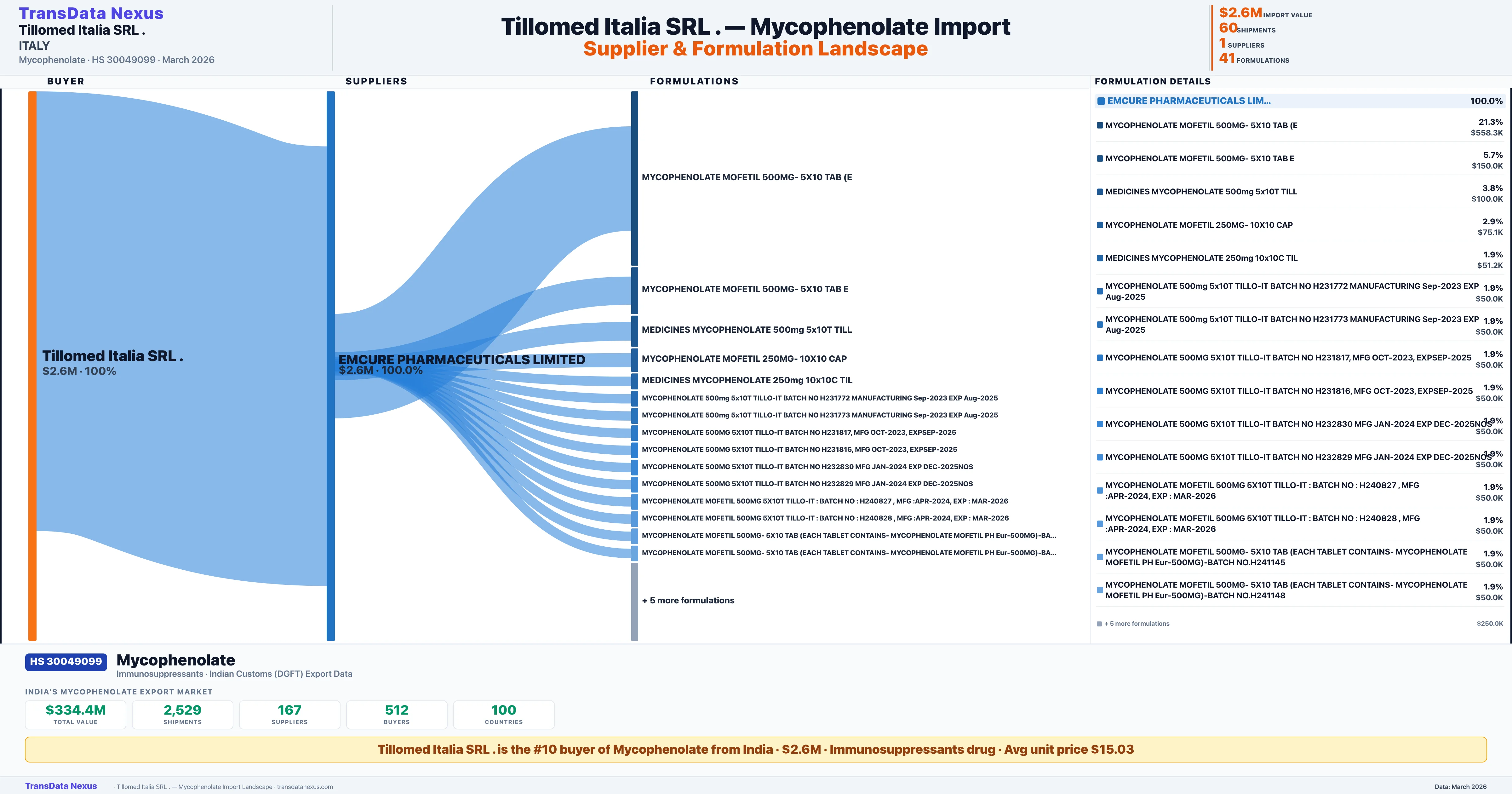TILLOMED ITALIA SRL sources Mycophenolate from 1 verified Indian supplier: EMCURE PHARMACEUTICALS LIMITED ($2.6M, 100.0%). This is based on 60 customs records.