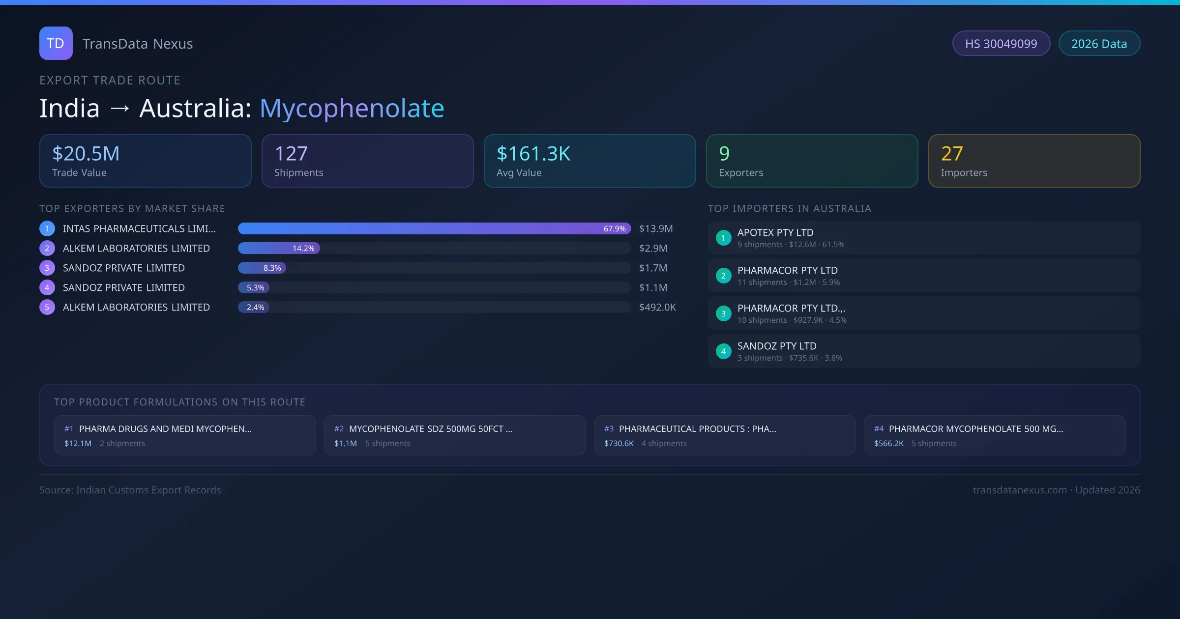India has recorded 127 verified shipments of Mycophenolate exported to Australia, representing a combined trade value of $20.5M USD. This corridor is served by 9 active Indian exporters, with an average shipment value of $161.3K USD. The leading Indian exporter is INTAS PHARMACEUTICALS LIMITED, which accounts for 68% of total export value with 27 shipments worth $13.9M USD. On the buying side, APOTEX PTY LTD is the largest importer in Australia with $12.6M USD in purchases. The top 3 suppliers — INTAS PHARMACEUTICALS LIMITED, ALKEM LABORATORIES LIMITED, SANDOZ PRIVATE LIMITED — together control 90% of total trade value on this route. All data sourced from Indian Customs (DGFT) shipping bill records. Values reported in FOB USD.