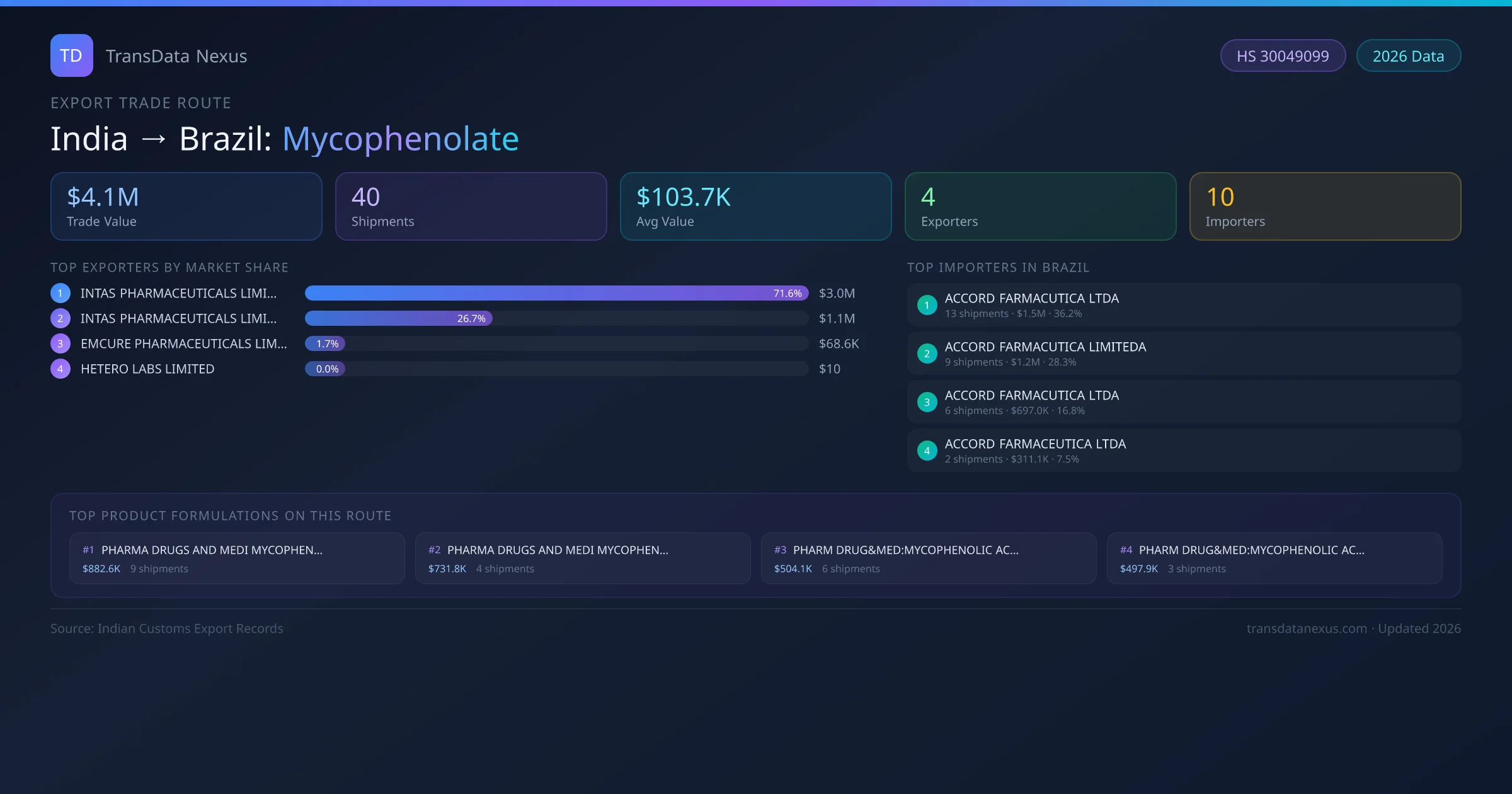 India exports Mycophenolate to Brazil worth approximately $4.1M USD across 40 recorded shipments. The average value per shipment is $103.7K USD.
