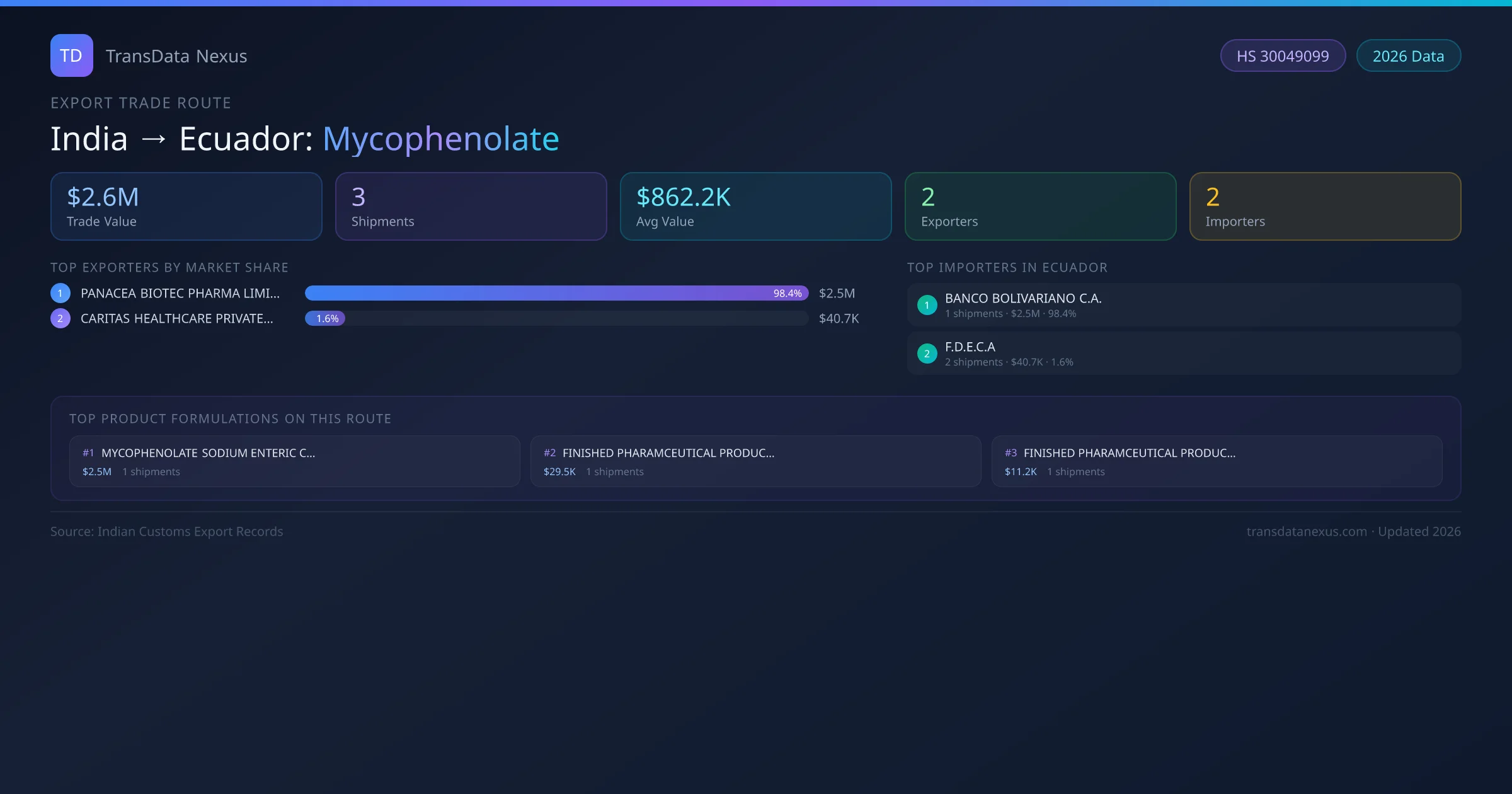 - 1.Route Identification: India to Ecuador export trade corridor identified from Indian Customs (DGFT) records for Mycophenolate.