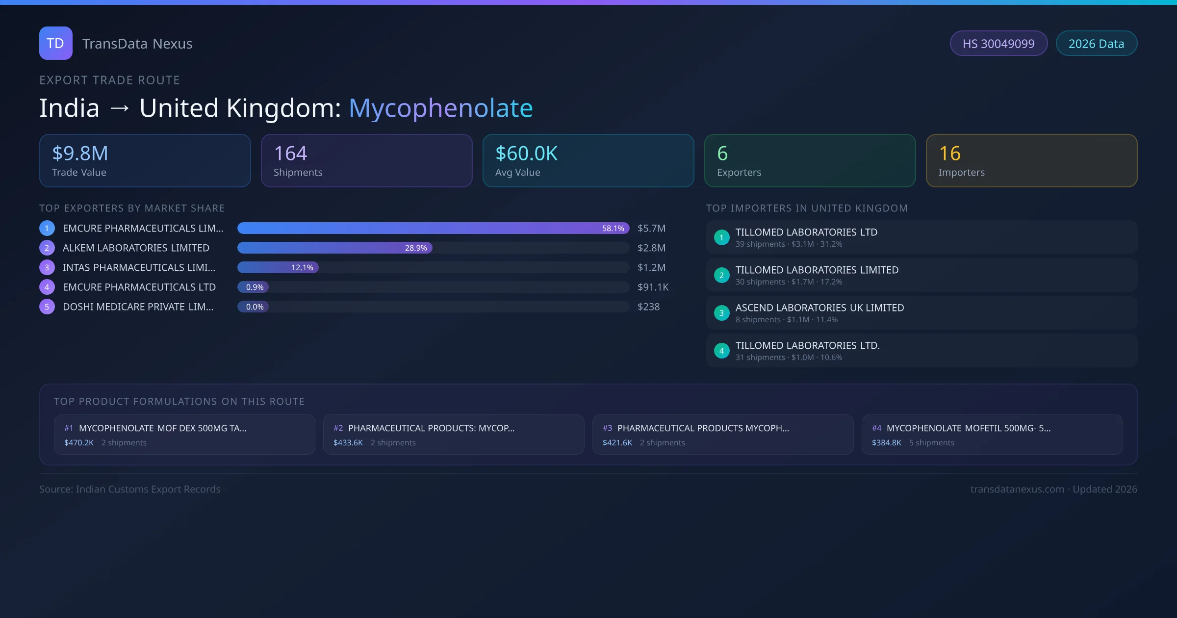 India has recorded 164 verified shipments of Mycophenolate exported to United Kingdom, representing a combined trade value of $9.8M USD. This corridor is served by 6 active Indian exporters, with an average shipment value of $60.0K USD. The leading Indian exporter is EMCURE PHARMACEUTICALS LIMITED, which accounts for 58% of total export value with 99 shipments worth $5.7M USD. On the buying side, TILLOMED LABORATORIES LTD is the largest importer in United Kingdom with $3.1M USD in purchases. The top 3 suppliers — EMCURE PHARMACEUTICALS LIMITED, ALKEM LABORATORIES LIMITED, INTAS PHARMACEUTICALS LIMITED — together control 99% of total trade value on this route. All data sourced from Indian Customs (DGFT) shipping bill records. Values reported in FOB USD.