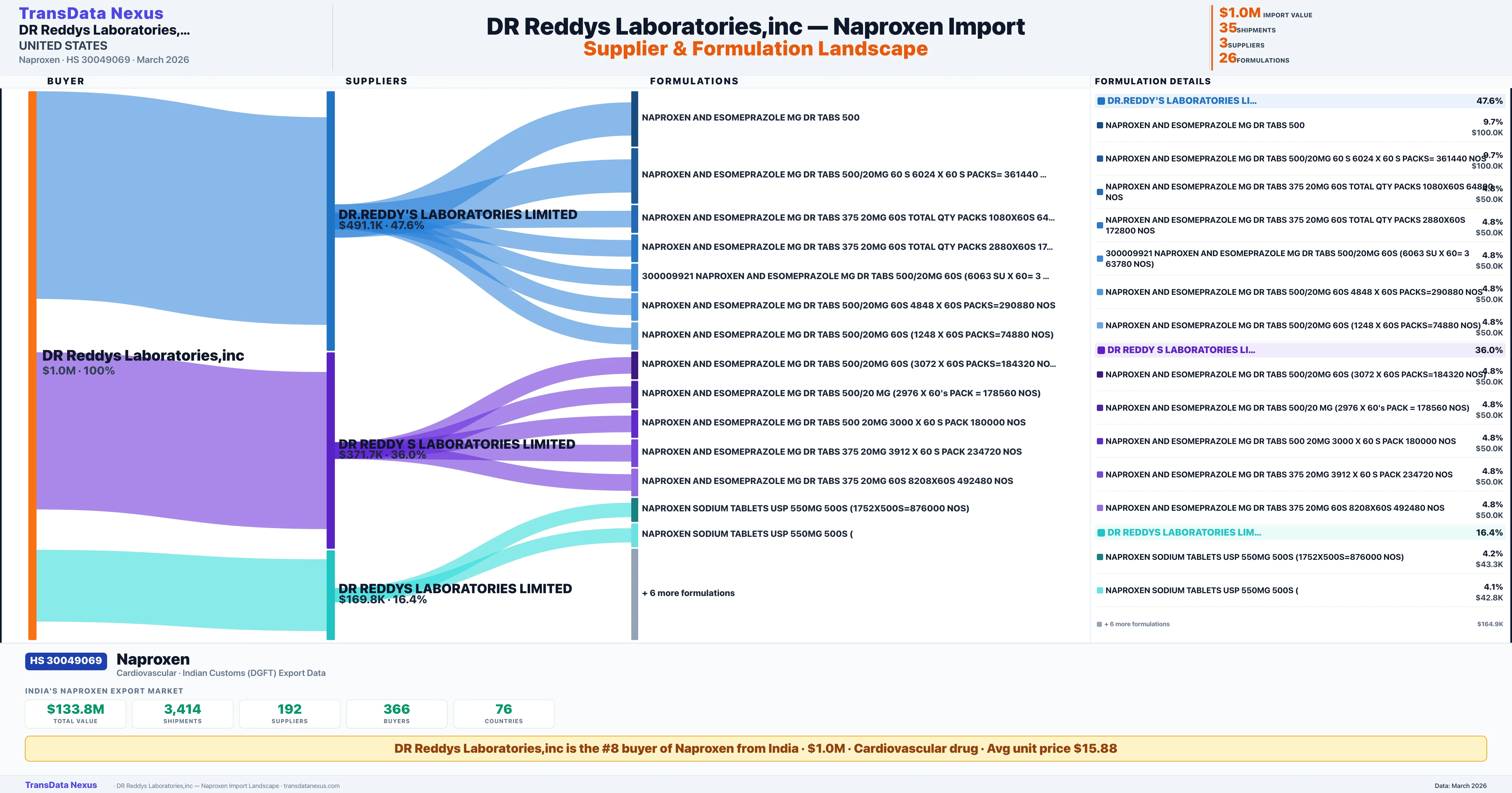 DR REDDYS LABORATORIES INC sources Naproxen from 3 verified Indian suppliers: DR.REDDY'S LABORATORIES LIMITED ($491.1K, 47.6%), DR REDDY S LABORATORIES LIMITED ($371.7K, 36.0%), DR REDDYS LABORATORIES LIMITED ($169.8K, 16.4%). This is based on 35 customs records.