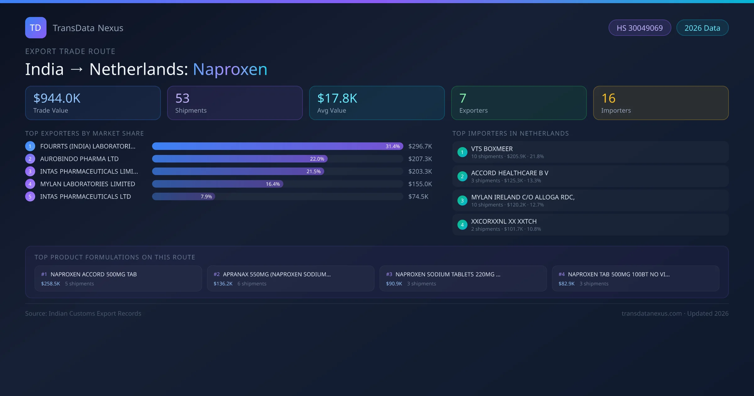 The India to Netherlands Naproxen corridor is one of India's established pharmaceutical export routes, with 53 shipments documented worth a combined $944.0K USD. The route is dominated by FOURRTS (INDIA) LABORATORIES PRIVATE LIMITED, which alone accounts for roughly 31% of all export value, reflecting the consolidated nature of India's naproxen manufacturing sector.