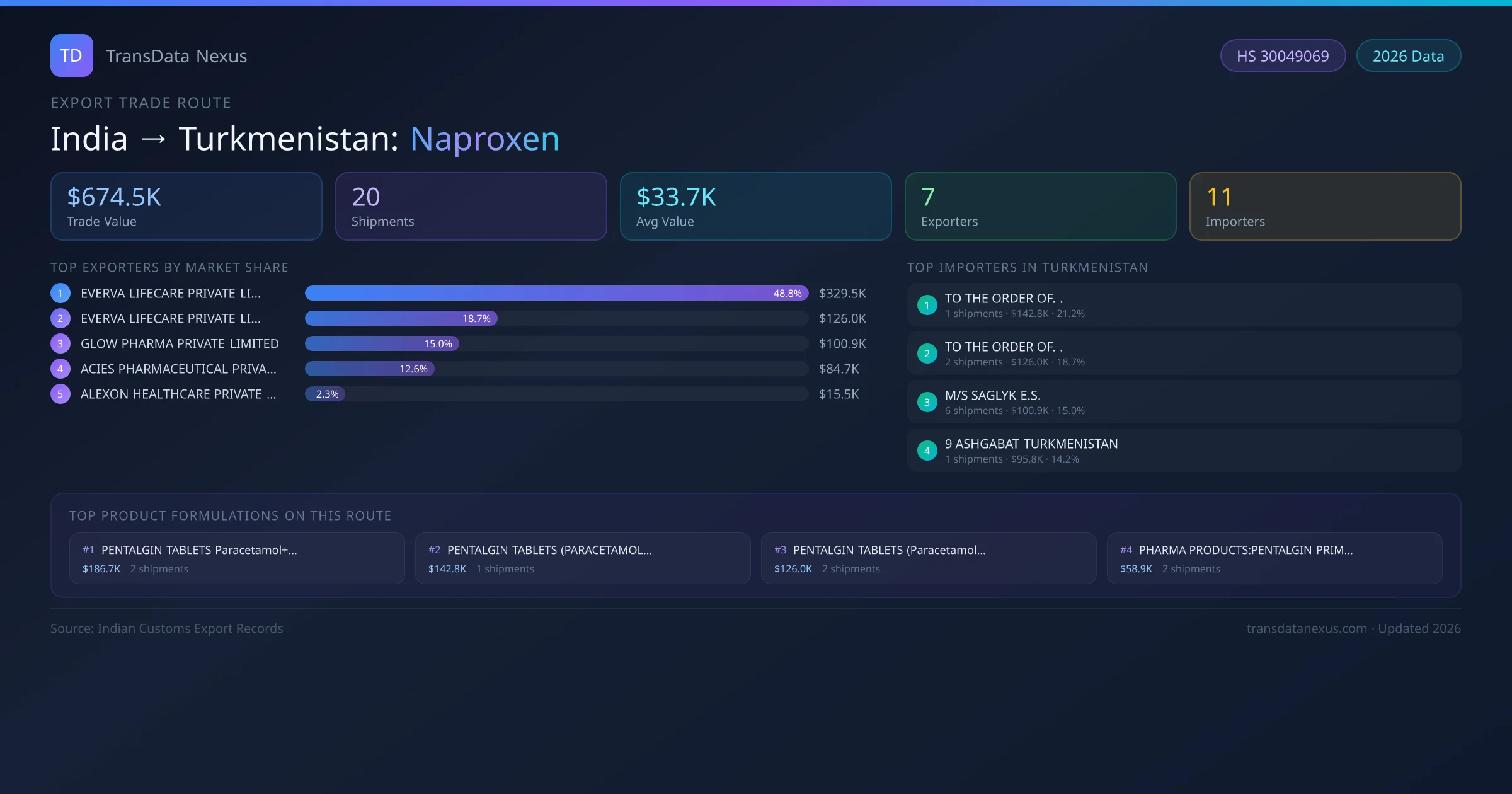 India has recorded 20 verified shipments of Naproxen exported to Turkmenistan, representing a combined trade value of $674.5K USD. This corridor is served by 7 active Indian exporters, with an average shipment value of $33.7K USD. The leading Indian exporter is EVERVA LIFECARE PRIVATE LIMITED, which accounts for 49% of total export value with 3 shipments worth $329.5K USD. On the buying side, TO THE ORDER OF. . is the largest importer in Turkmenistan with $142.8K USD in purchases. The top 3 suppliers — EVERVA LIFECARE PRIVATE LIMITED, EVERVA LIFECARE PRIVATE LIMITED , GLOW PHARMA PRIVATE LIMITED — together control 82% of total trade value on this route. All data sourced from Indian Customs (DGFT) shipping bill records. Values reported in FOB USD.