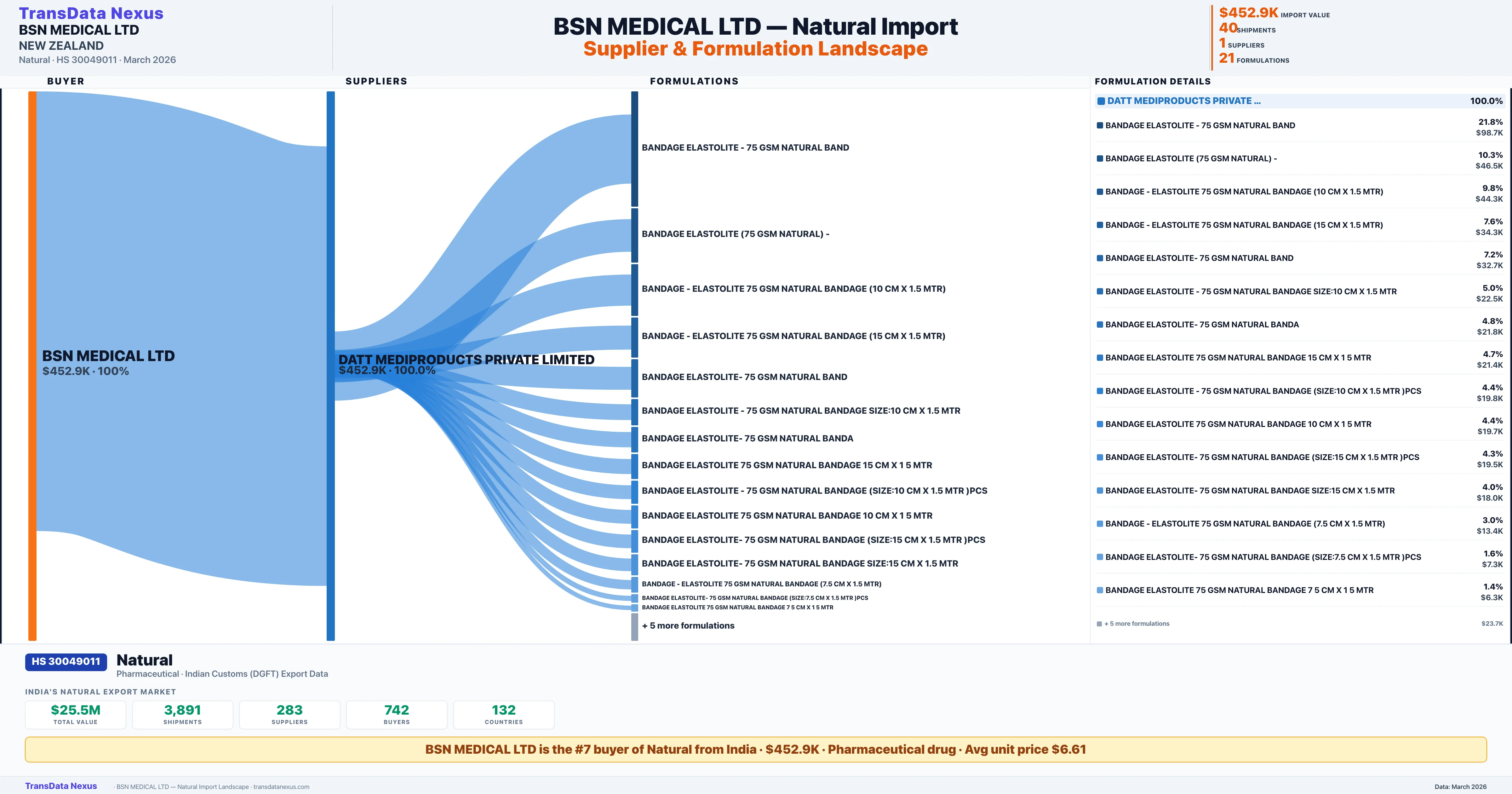 Access order-level details, pricing data, supplier connections, and competitive analysis for BSN MEDICAL LTD's Natural imports. TransData Nexus provides verified Indian Customs (DGFT) data trusted by pharmaceutical trade professionals worldwide.