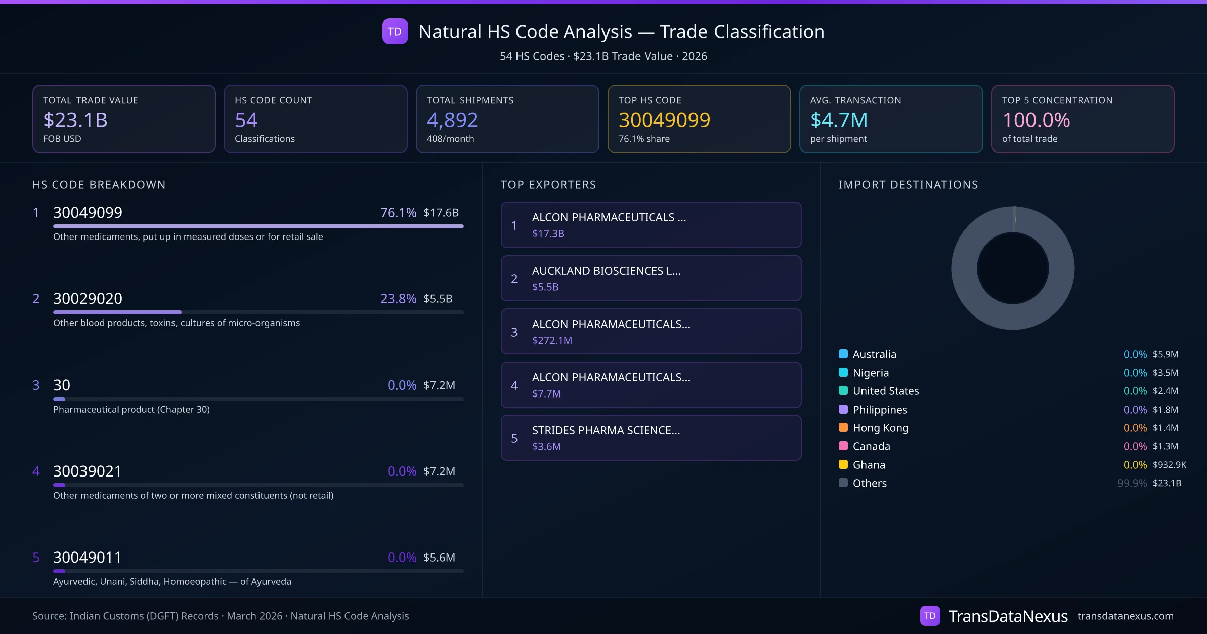 India exports Natural under 54 distinct HS code classifications, representing a total trade value of $23.1B across 4,892 shipments. The dominant classification is HS 30049099 (Other medicaments, put up in measured doses or for retail sale), accounting for 76.1% of all Natural trade at $17.6B. HS 30029020 (Other blood products, toxins, cultures of micro-organisms) follows at 23.8% ($5.5B). The top 5 HS codes together account for 100.0% of total Natural trade from India. The average transaction value is $4723543. Key importing markets include Australia, Nigeria, United States. Leading exporters include ALCON PHARMACEUTICALS LTD and AUCKLAND BIOSCIENCES LIMITED. . Data sourced from Indian Customs (DGFT) shipping bill records.