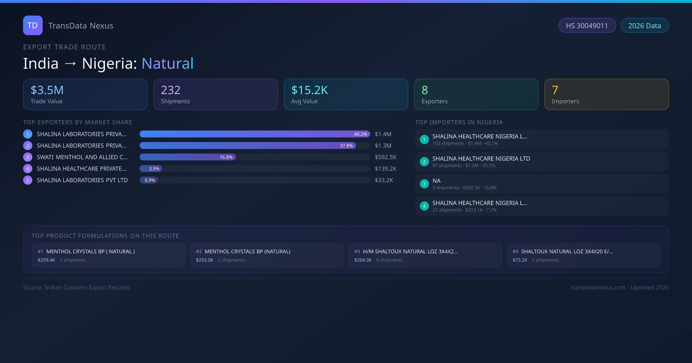 The leading Indian exporters of Natural to Nigeria are SHALINA LABORATORIES PRIVATE LIMITED , SHALINA LABORATORIES PRIVATE LIMITED, SWATI MENTHOL AND ALLIED CHEMICALS LIMITED . SHALINA LABORATORIES PRIVATE LIMITED holds the largest market share at approximately 40% of total trade value on this route.