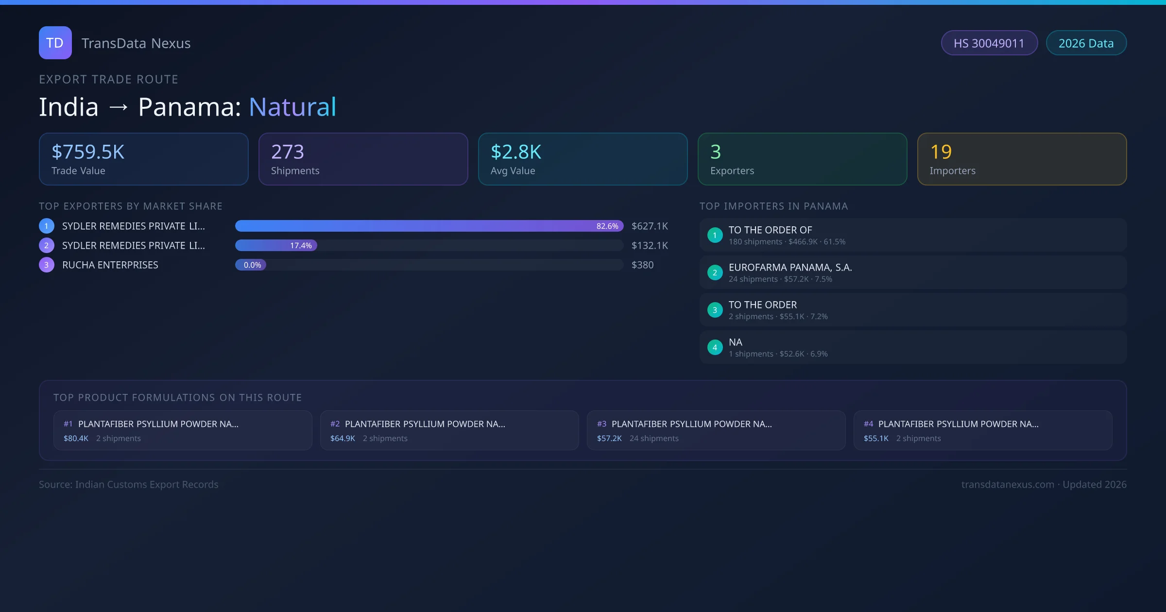 Beyond the primary product category, shipments on this route include closely related formulations such as plantafiber psyllium powder natural flavor (flask 400 g)nos and plantafiber psyllium powder natural flav , suggesting that buyers in Panama tend to consolidate orders across related product lines from the same Indian supplier.