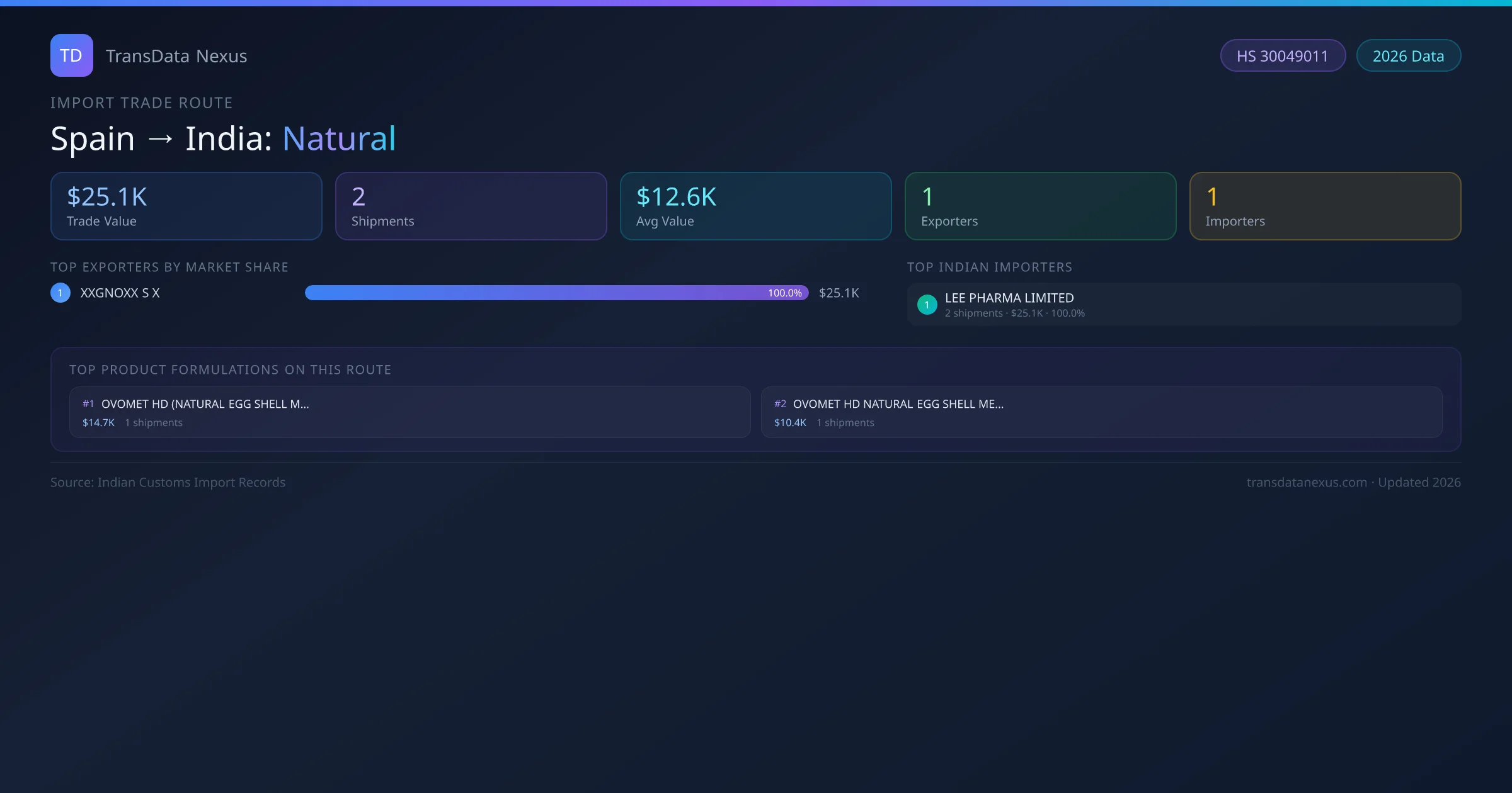 India has recorded 2 verified shipments of Natural imported from Spain, representing a combined trade value of $25.1K USD. This corridor is served by 1 active Spain exporters, with an average shipment value of $12.6K USD. The leading Spain supplier is XXGNOXX S X, which accounts for 100% of total import value with 2 shipments worth $25.1K USD. On the buying side, LEE PHARMA LIMITED is the largest Indian importer with $25.1K USD in purchases. All data sourced from Indian Customs (DGFT) shipping bill of entry records. Values reported in FOB USD.