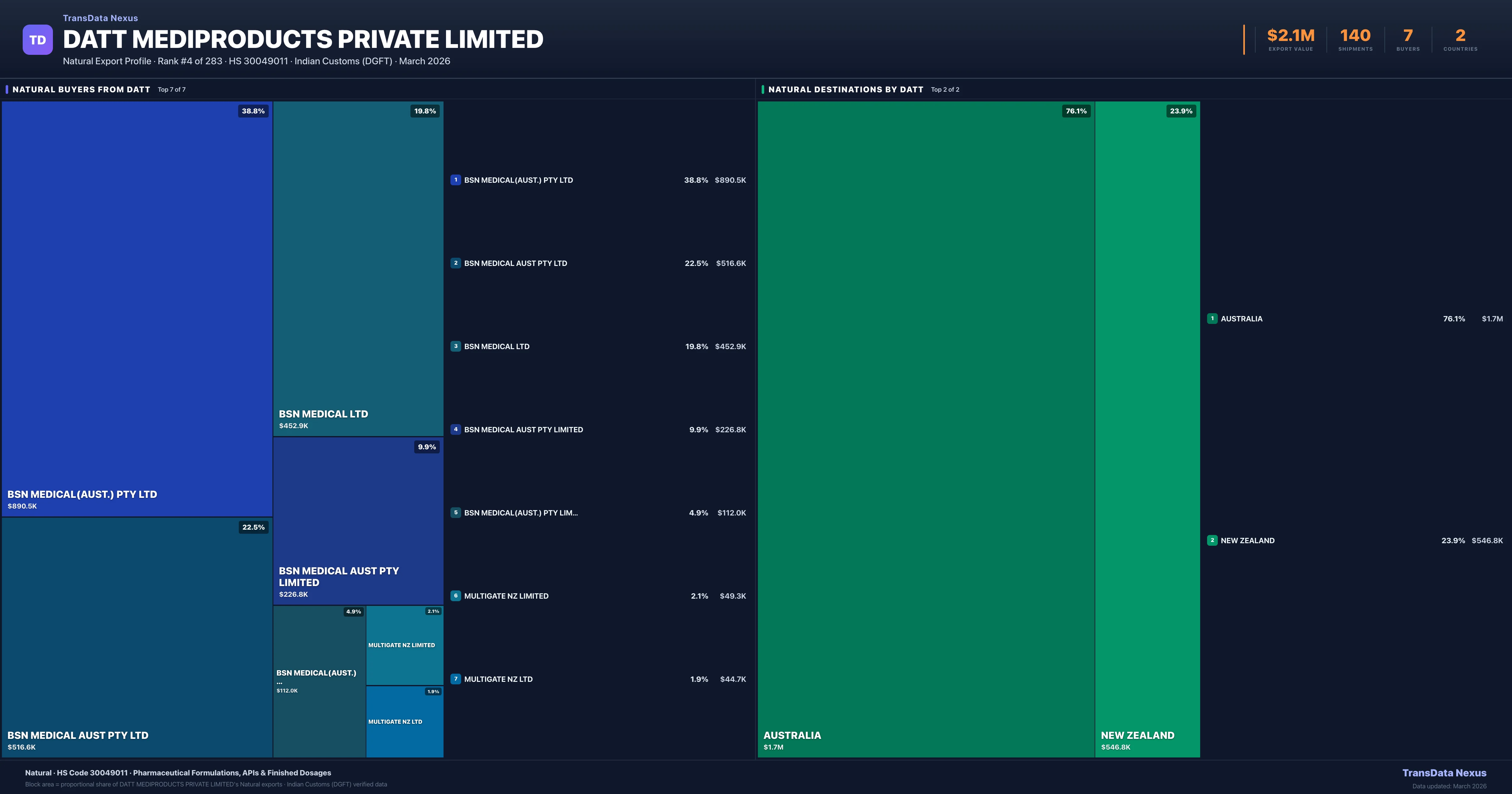 Datt Mediproducts Private Limited supplies Natural to 7 buyers globally. The largest buyer is BSN MEDICAL(AUST.) PTY LTD (AUSTRALIA), followed by BSN MEDICAL AUST PTY LTD (AUSTRALIA) and BSN MEDICAL LTD (NEW ZEALAND). These buyers represent pharmaceutical distributors, hospital groups, and government procurement agencies in their respective markets.