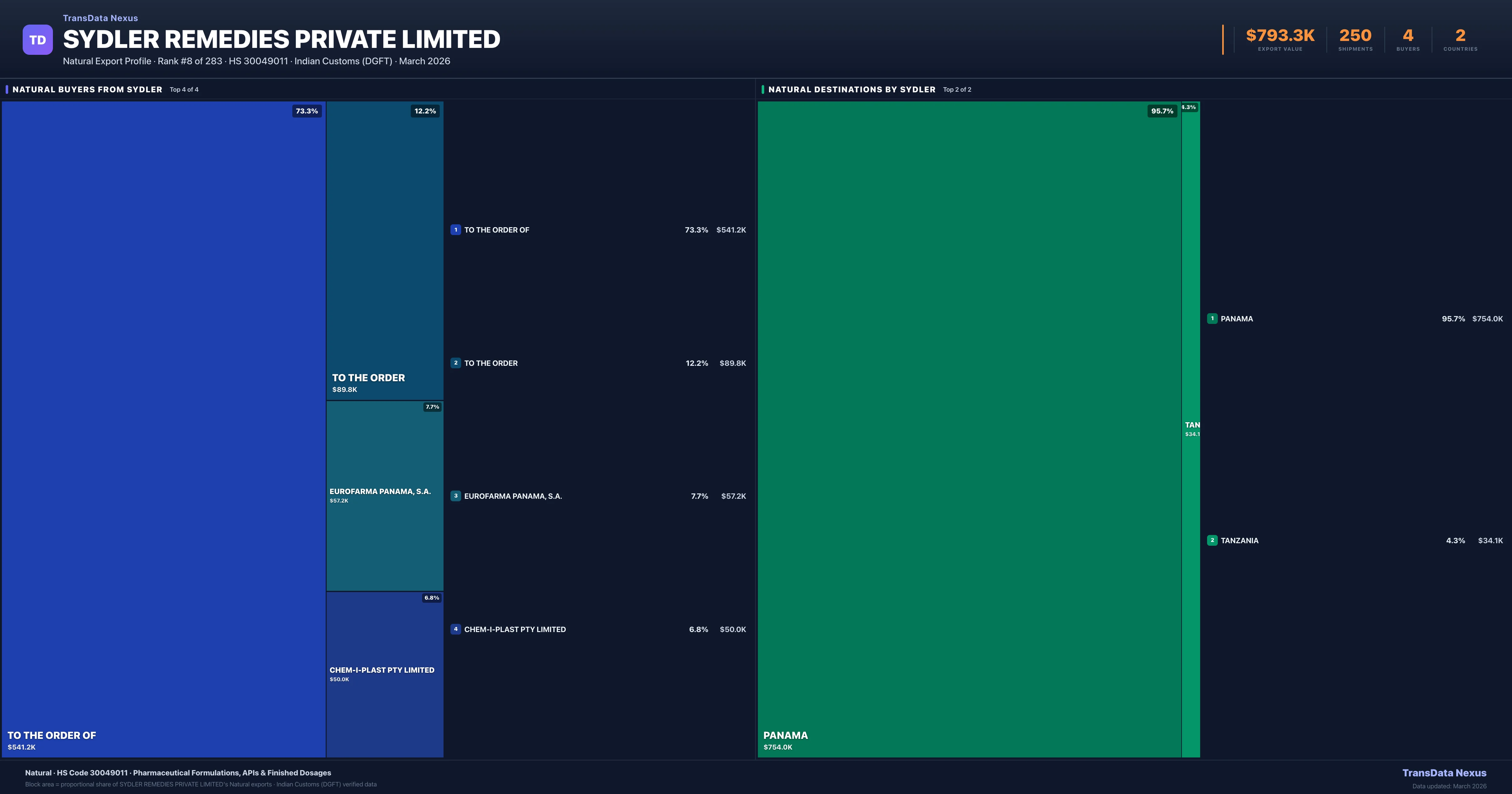 Sydler Remedies Private Limited supplies Natural to 4 buyers globally. The largest buyer is TO THE ORDER OF (PANAMA), followed by TO THE ORDER (PANAMA) and EUROFARMA PANAMA, S.A. (PANAMA). These buyers represent pharmaceutical distributors, hospital groups, and government procurement agencies in their respective markets.