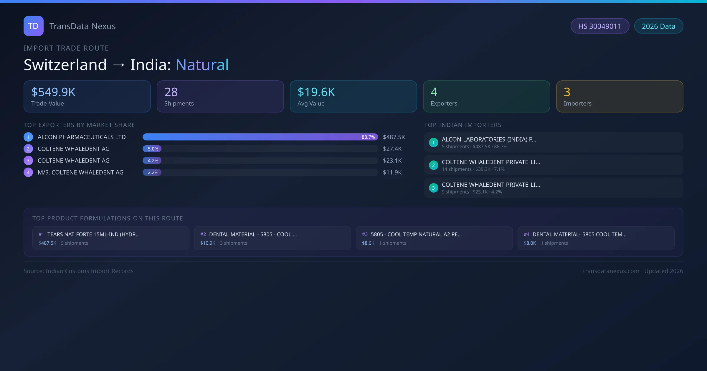 India has recorded 28 verified shipments of Natural imported from Switzerland, representing a combined trade value of $549.9K USD. This corridor is served by 4 active Switzerland exporters, with an average shipment value of $19.6K USD. The leading Switzerland supplier is ALCON PHARMACEUTICALS LTD, which accounts for 89% of total import value with 5 shipments worth $487.5K USD. On the buying side, ALCON LABORATORIES (INDIA) PRIVATE LIMITED is the largest Indian importer with $487.5K USD in purchases. The top 3 suppliers — ALCON PHARMACEUTICALS LTD, COLTENE WHALEDENT AG , COLTENE WHALEDENT AG — together control 98% of total trade value on this route. All data sourced from Indian Customs (DGFT) shipping bill of entry records. Values reported in FOB USD.
