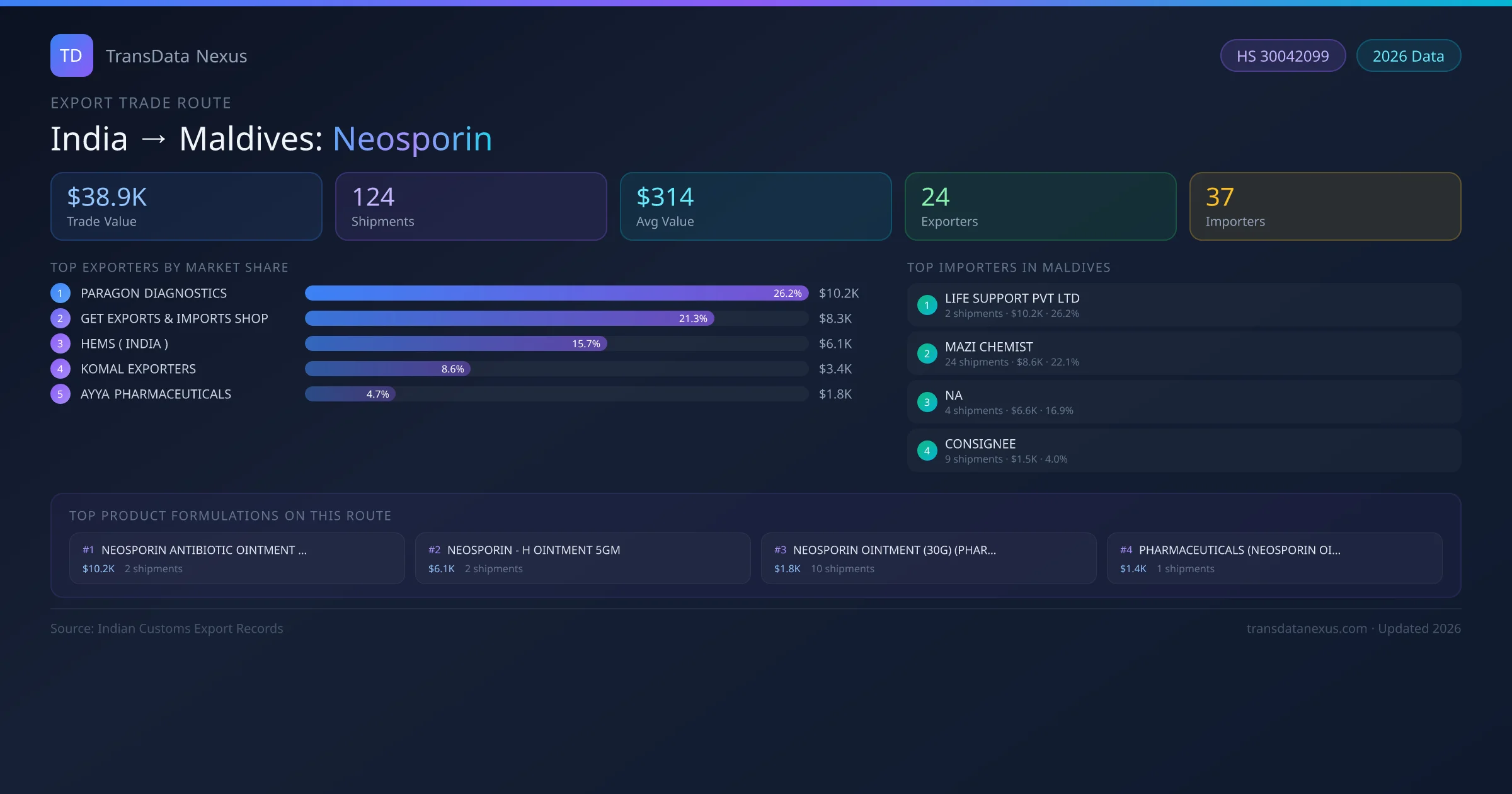 The India to Maldives Neosporin corridor is one of India's established pharmaceutical export routes, with 124 shipments documented worth a combined $38.9K USD. The route is dominated by PARAGON DIAGNOSTICS, which alone accounts for roughly 26% of all export value, reflecting the consolidated nature of India's neosporin manufacturing sector.