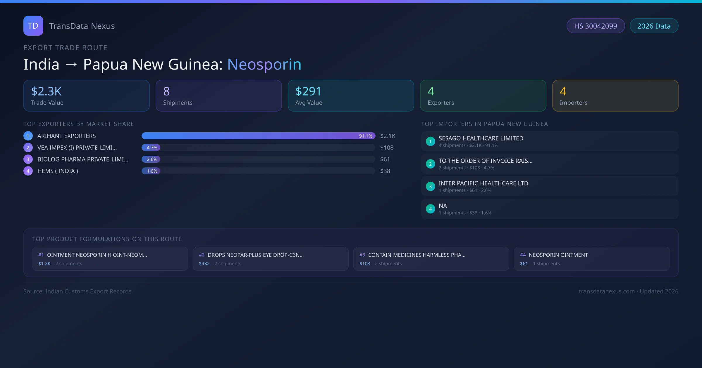 India has recorded 8 verified shipments of Neosporin exported to Papua New Guinea, representing a combined trade value of $2.3K USD. This corridor is served by 4 active Indian exporters, with an average shipment value of $291 USD. The leading Indian exporter is ARIHANT EXPORTERS, which accounts for 91% of total export value with 4 shipments worth $2.1K USD. On the buying side, SESAGO HEALTHCARE LIMITED is the largest importer in Papua New Guinea with $2.1K USD in purchases. The top 3 suppliers — ARIHANT EXPORTERS, VEA IMPEX (I) PRIVATE LIMITED, BIOLOG PHARMA PRIVATE LIMITED — together control 98% of total trade value on this route. All data sourced from Indian Customs (DGFT) shipping bill records. Values reported in FOB USD.