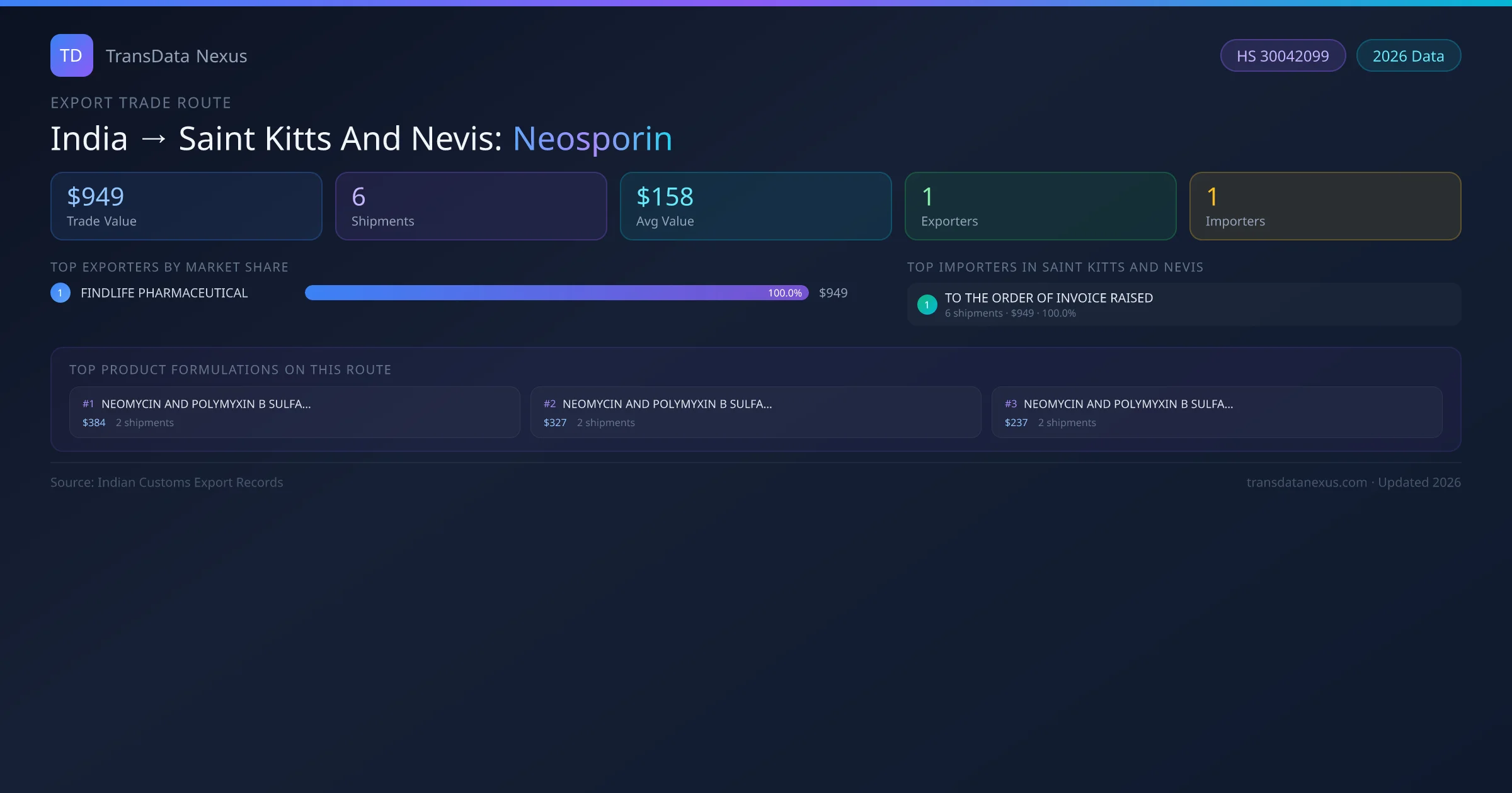 The India to Saint Kitts And Nevis Neosporin corridor is one of India's established pharmaceutical export routes, with 6 shipments documented worth a combined $949 USD. The route is dominated by FINDLIFE PHARMACEUTICAL, which alone accounts for roughly 100% of all export value, reflecting the consolidated nature of India's neosporin manufacturing sector.