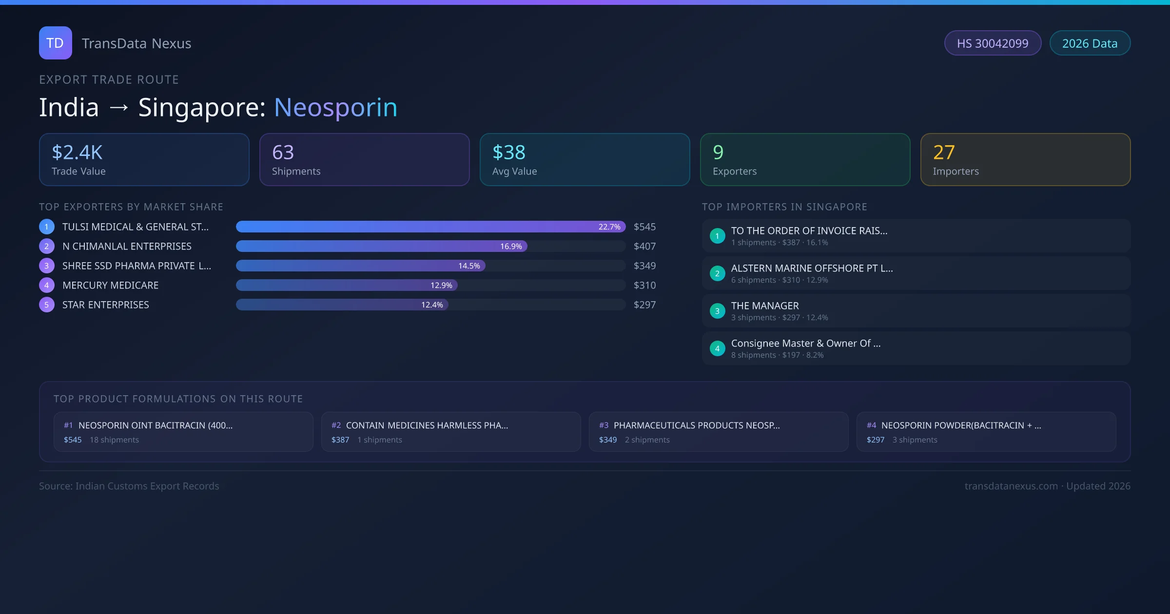 India has recorded 63 verified shipments of Neosporin exported to Singapore, representing a combined trade value of $2.4K USD. This corridor is served by 9 active Indian exporters, with an average shipment value of $38 USD. The leading Indian exporter is TULSI MEDICAL & GENERAL STORES , which accounts for 23% of total export value with 21 shipments worth $545 USD. On the buying side, TO THE ORDER OF INVOICE RAISED TO is the largest importer in Singapore with $387 USD in purchases. The top 3 suppliers — TULSI MEDICAL & GENERAL STORES , N CHIMANLAL ENTERPRISES, SHREE SSD PHARMA PRIVATE LIMITED — together control 54% of total trade value on this route. All data sourced from Indian Customs (DGFT) shipping bill records. Values reported in FOB USD.