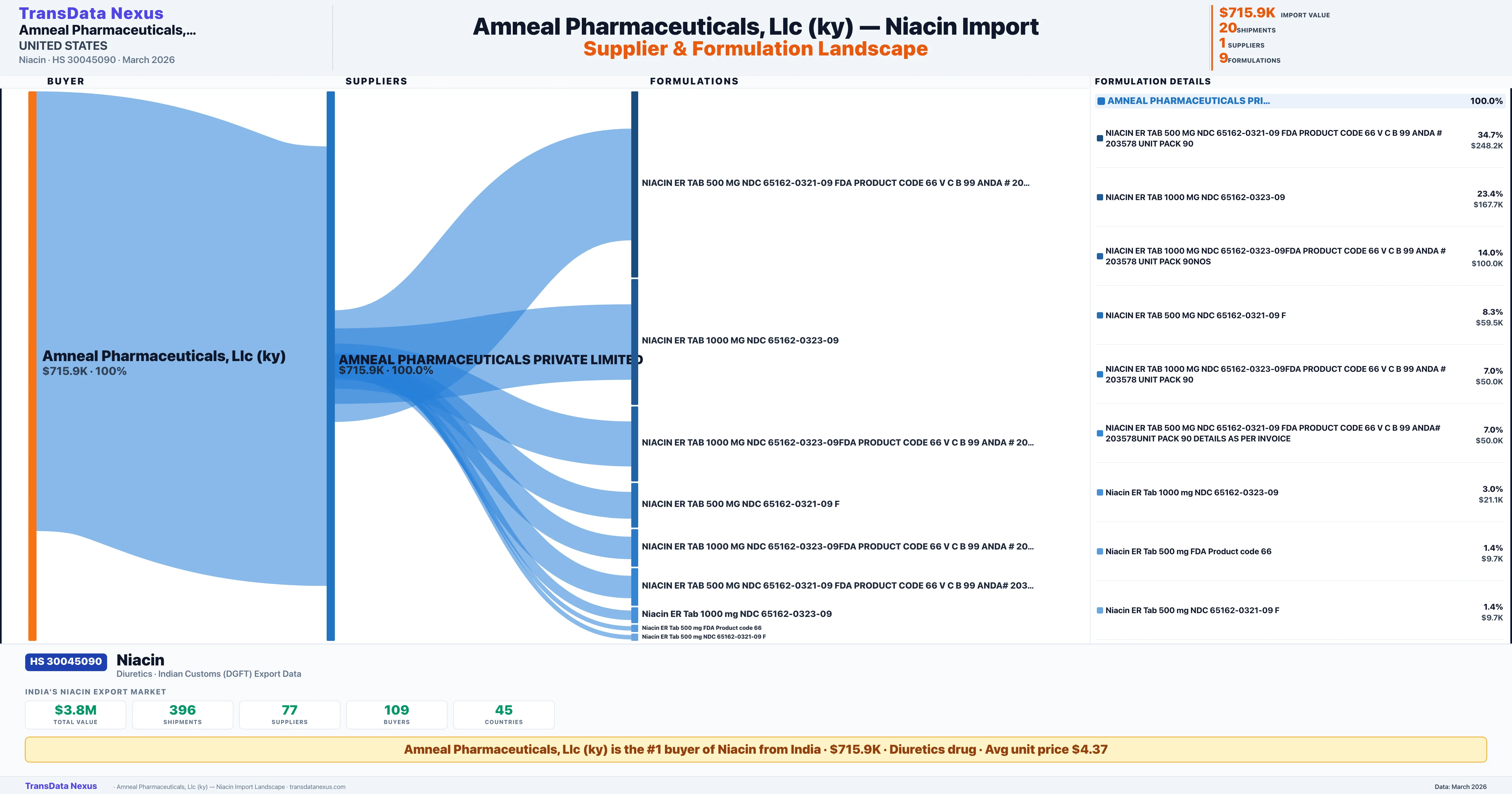 AMNEAL PHARMACEUTICALS, LLC (KY) sources Niacin from 1 verified Indian supplier: AMNEAL PHARMACEUTICALS PRIVATE LIMITED ($715.9K, 100.0%). This is based on 20 customs records.