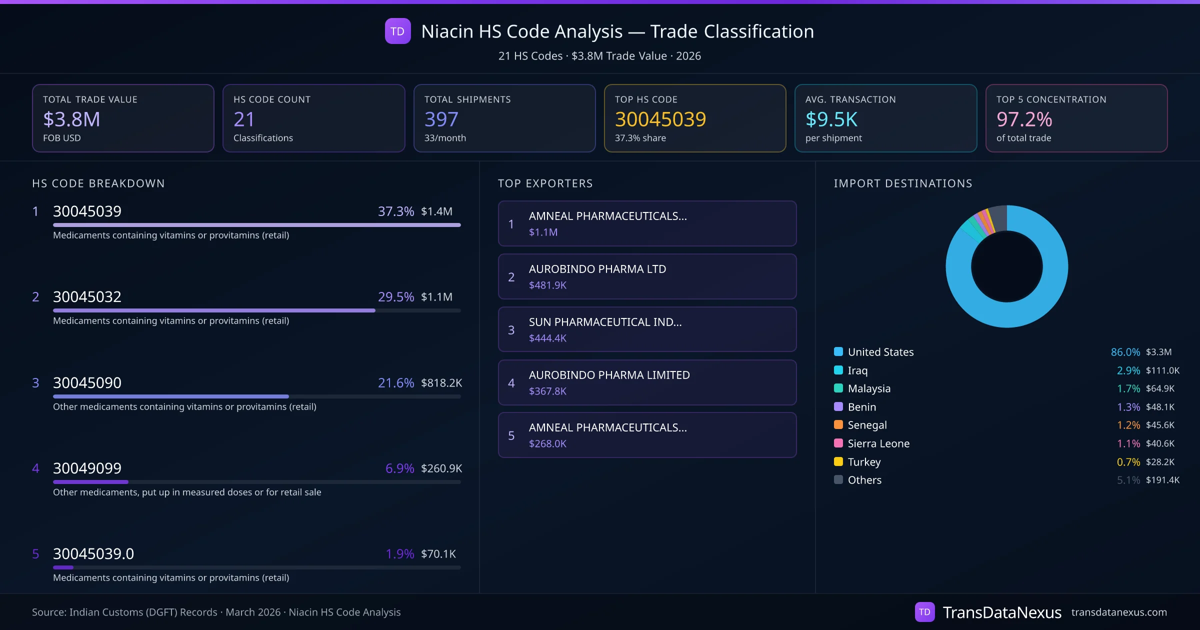 India exports Niacin under 21 distinct HS code classifications, representing a total trade value of $3.8M across 397 shipments. The dominant classification is HS 30045039 (Medicaments containing vitamins or provitamins (retail)), accounting for 37.3% of all Niacin trade at $1.4M. HS 30045032 (Medicaments containing vitamins or provitamins (retail)) follows at 29.5% ($1.1M). The top 5 HS codes together account for 97.2% of total Niacin trade from India. The average transaction value is $9534. Key importing markets include United States, Iraq, Malaysia. Leading exporters include AMNEAL PHARMACEUTICALS PRIVATE LIMITED and AUROBINDO PHARMA LTD. Data sourced from Indian Customs (DGFT) shipping bill records.