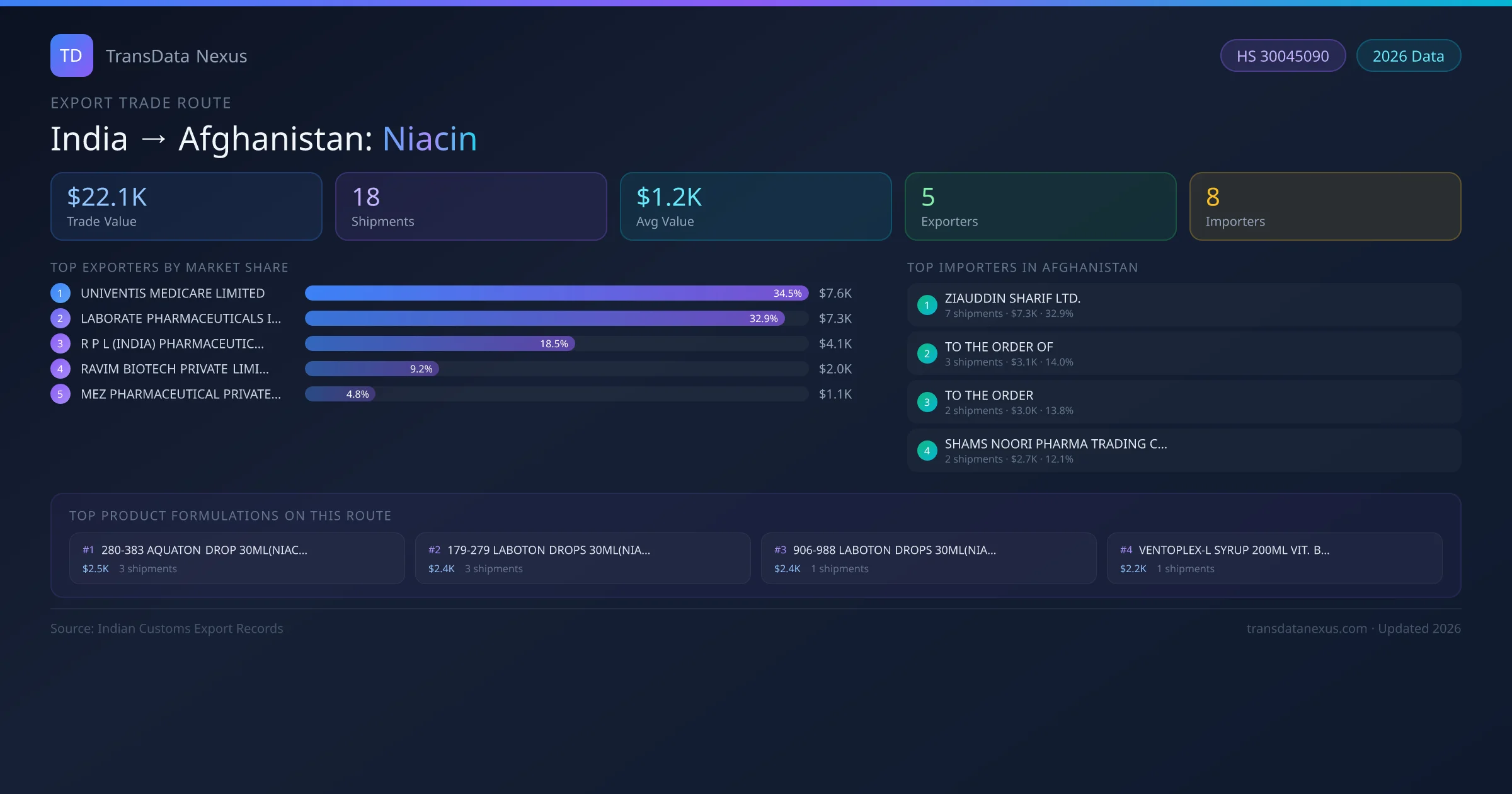 The India to Afghanistan Niacin corridor is one of India's established pharmaceutical export routes, with 18 shipments documented worth a combined $22.1K USD. The route is dominated by UNIVENTIS MEDICARE LIMITED, which alone accounts for roughly 35% of all export value, reflecting the consolidated nature of India's niacin manufacturing sector.