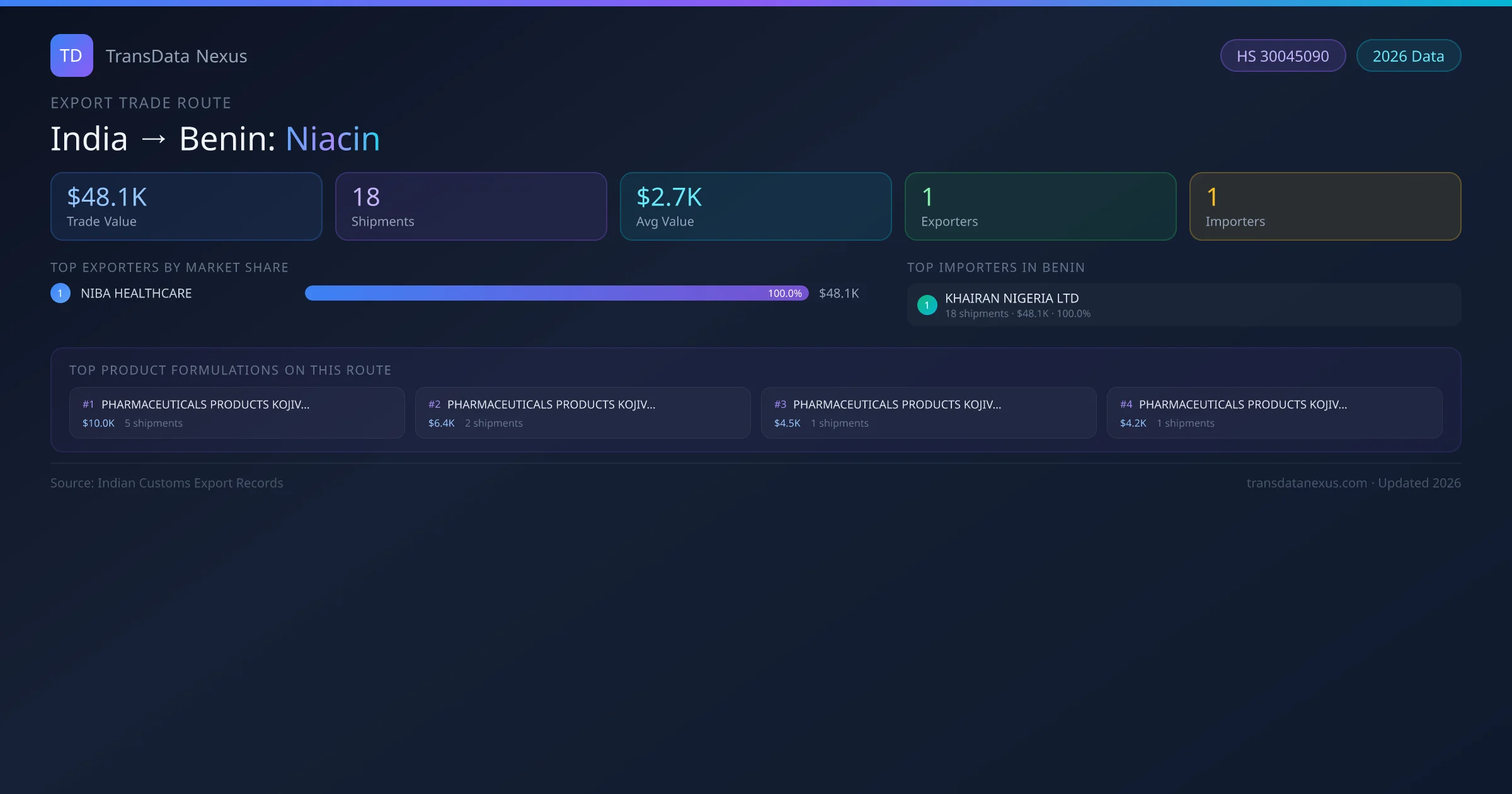 The India to Benin Niacin corridor is one of India's established pharmaceutical export routes, with 18 shipments documented worth a combined $48.1K USD. The route is dominated by NIBA HEALTHCARE, which alone accounts for roughly 100% of all export value, reflecting the consolidated nature of India's niacin manufacturing sector.