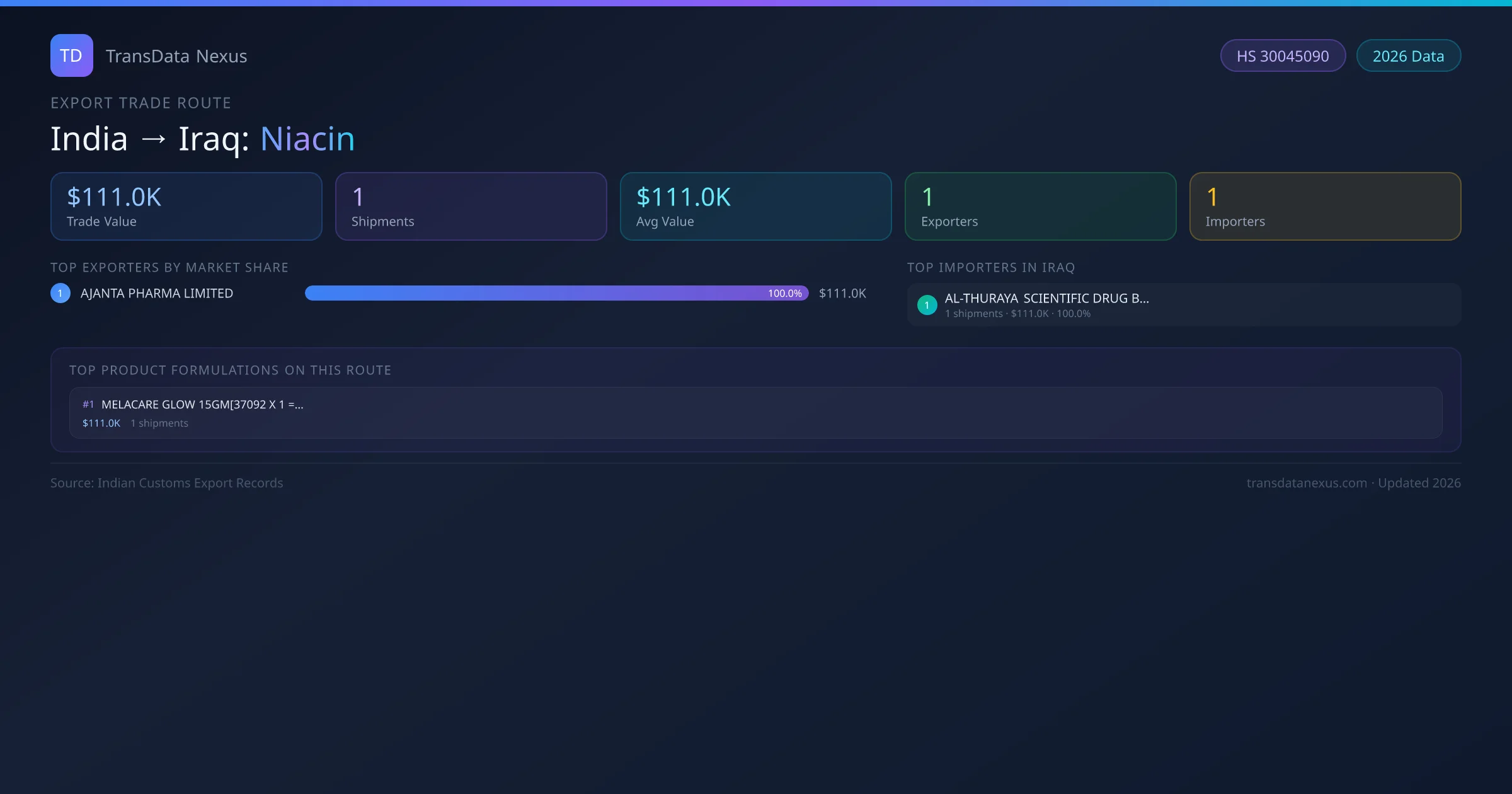 The India to Iraq Niacin corridor is one of India's established pharmaceutical export routes, with 1 shipments documented worth a combined $111.0K USD. The route is dominated by AJANTA PHARMA LIMITED, which alone accounts for roughly 100% of all export value, reflecting the consolidated nature of India's niacin manufacturing sector.