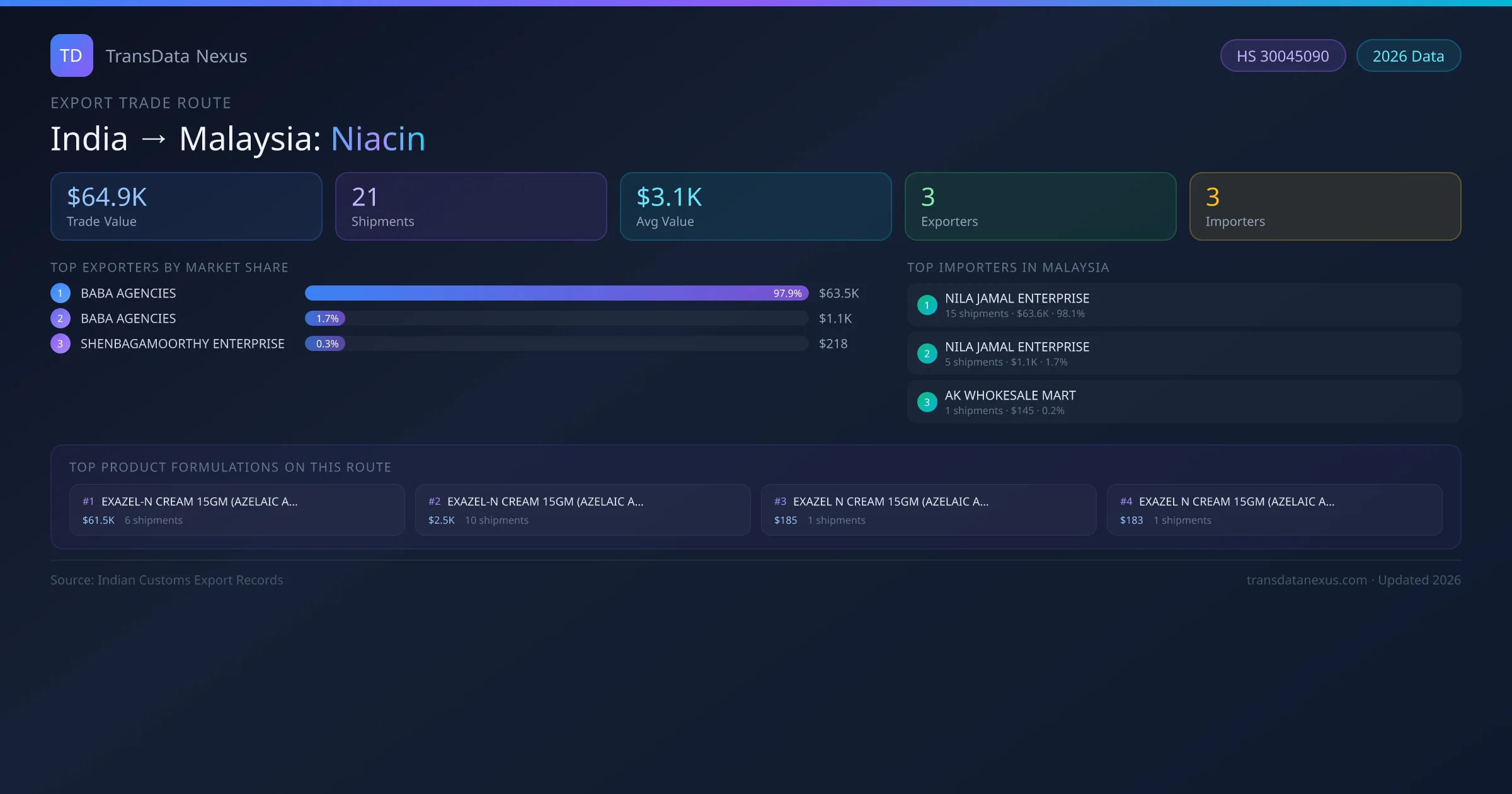 India has recorded 21 verified shipments of Niacin exported to Malaysia, representing a combined trade value of $64.9K USD. This corridor is served by 3 active Indian exporters, with an average shipment value of $3.1K USD. The leading Indian exporter is BABA AGENCIES, which accounts for 98% of total export value with 14 shipments worth $63.5K USD. On the buying side, NILA JAMAL ENTERPRISE is the largest importer in Malaysia with $63.6K USD in purchases. The top 3 suppliers — BABA AGENCIES, BABA AGENCIES , SHENBAGAMOORTHY ENTERPRISE — together control 100% of total trade value on this route. All data sourced from Indian Customs (DGFT) shipping bill records. Values reported in FOB USD.