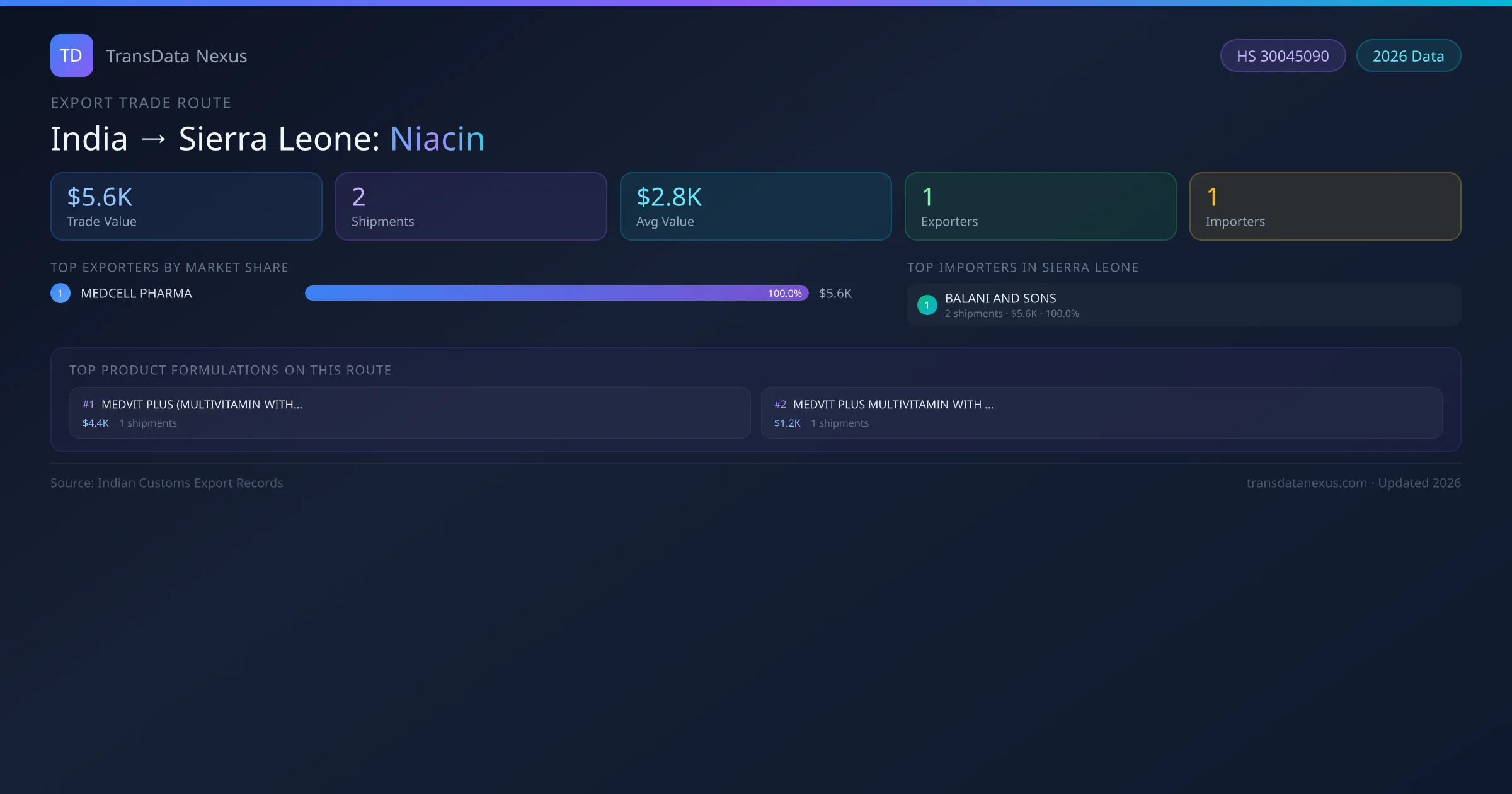 The India to Sierra Leone Niacin corridor is one of India's established pharmaceutical export routes, with 2 shipments documented worth a combined $5.6K USD. The route is dominated by MEDCELL PHARMA, which alone accounts for roughly 100% of all export value, reflecting the consolidated nature of India's niacin manufacturing sector.