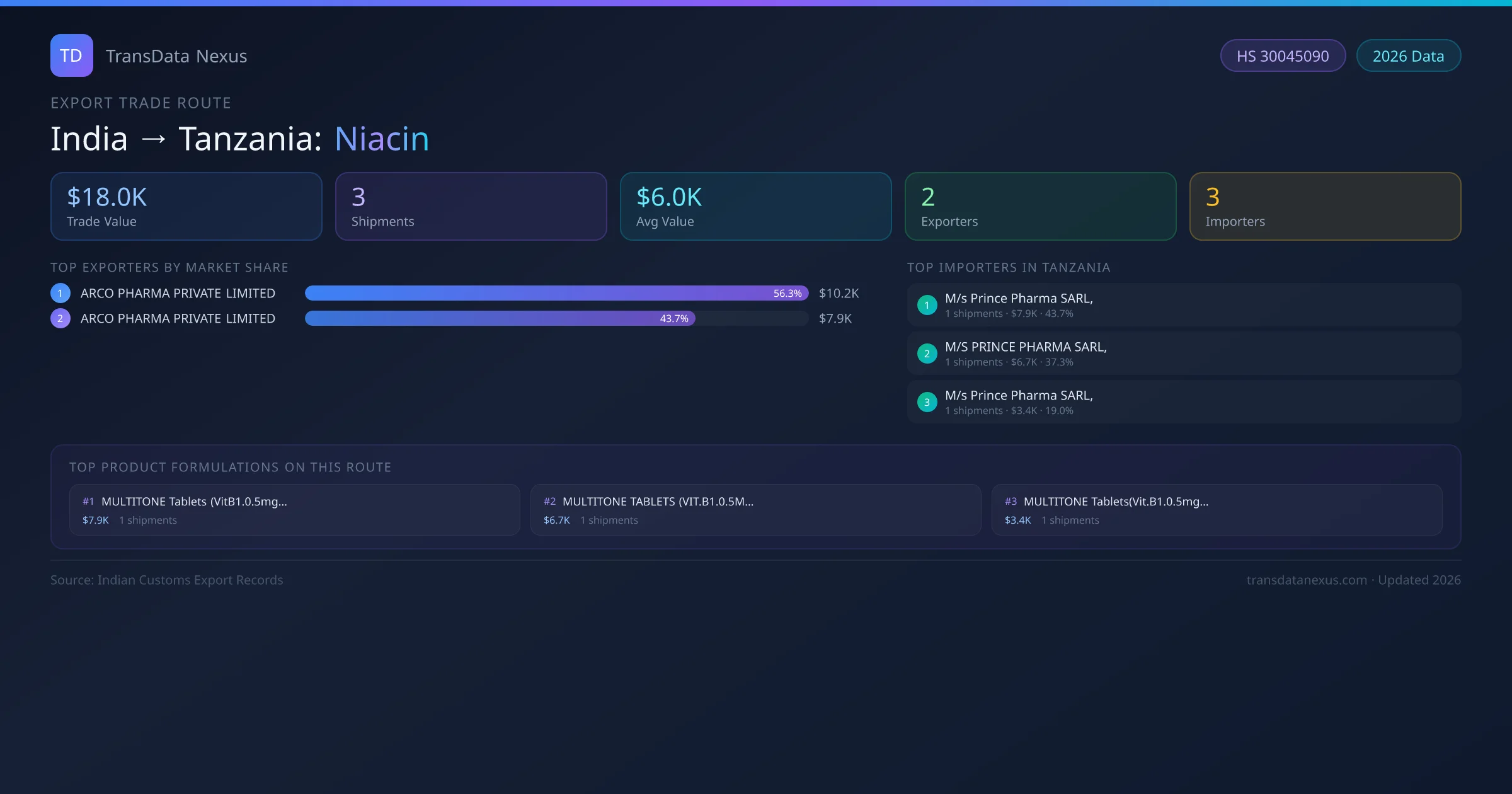 The India to Tanzania Niacin corridor is one of India's established pharmaceutical export routes, with 3 shipments documented worth a combined $18.0K USD. The route is dominated by ARCO PHARMA PRIVATE LIMITED, which alone accounts for roughly 56% of all export value, reflecting the consolidated nature of India's niacin manufacturing sector.