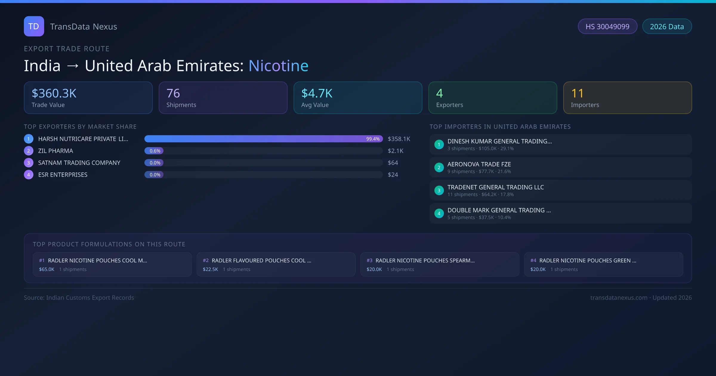 The India to United Arab Emirates Nicotine corridor is one of India's established pharmaceutical export routes, with 76 shipments documented worth a combined $360.3K USD. The route is dominated by HARSH NUTRICARE PRIVATE LIMITED, which alone accounts for roughly 99% of all export value, reflecting the consolidated nature of India's nicotine manufacturing sector.