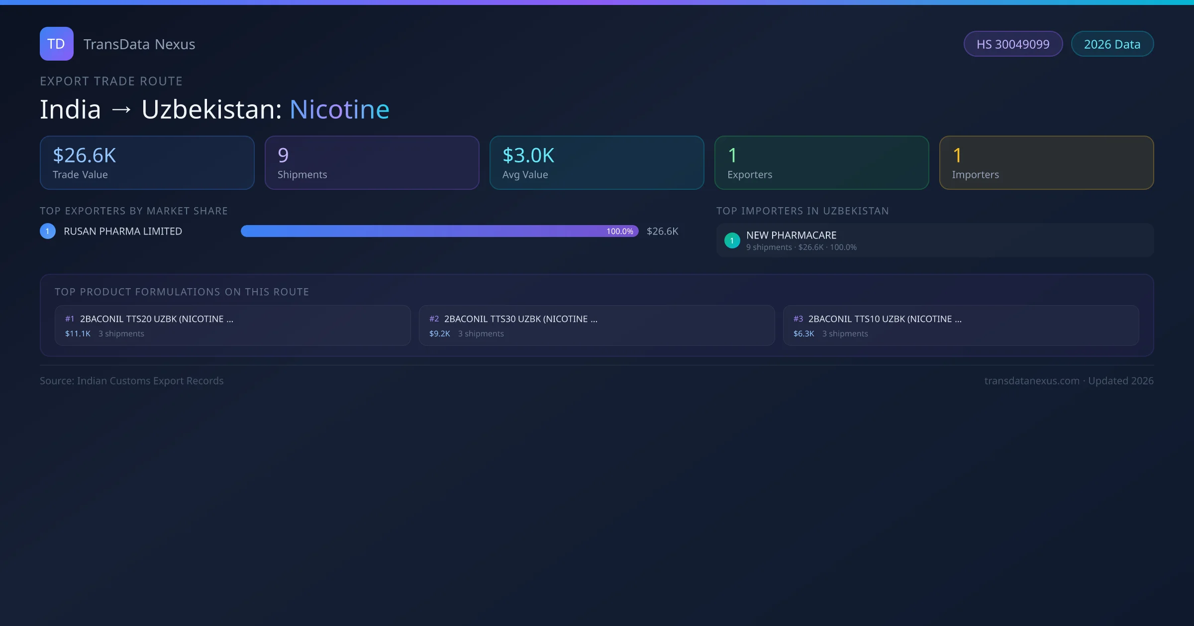 The India to Uzbekistan Nicotine corridor is one of India's established pharmaceutical export routes, with 9 shipments documented worth a combined $26.6K USD. The route is dominated by RUSAN PHARMA LIMITED , which alone accounts for roughly 100% of all export value, reflecting the consolidated nature of India's nicotine manufacturing sector.