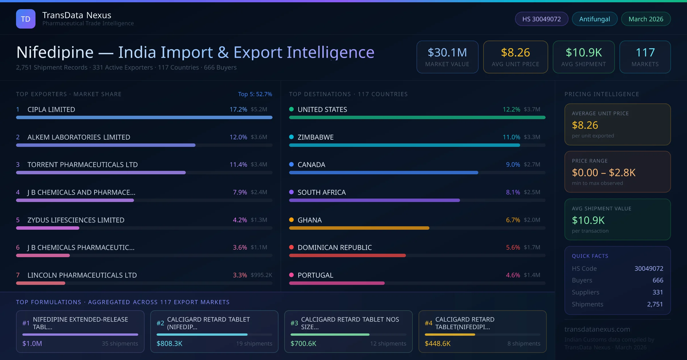 Between 2022 and 2026, India exported $30.1M worth of nifedipine across 2,751 verified shipments to 117 countries — covering 60% of world markets in the Cardiovascular segment. The largest destination is UNITED STATES (12.2%). CIPLA LIMITED leads with a 17.2% share. All figures are drawn from Indian Customs (DGFT) shipping bill records spanning four years of trade activity.
