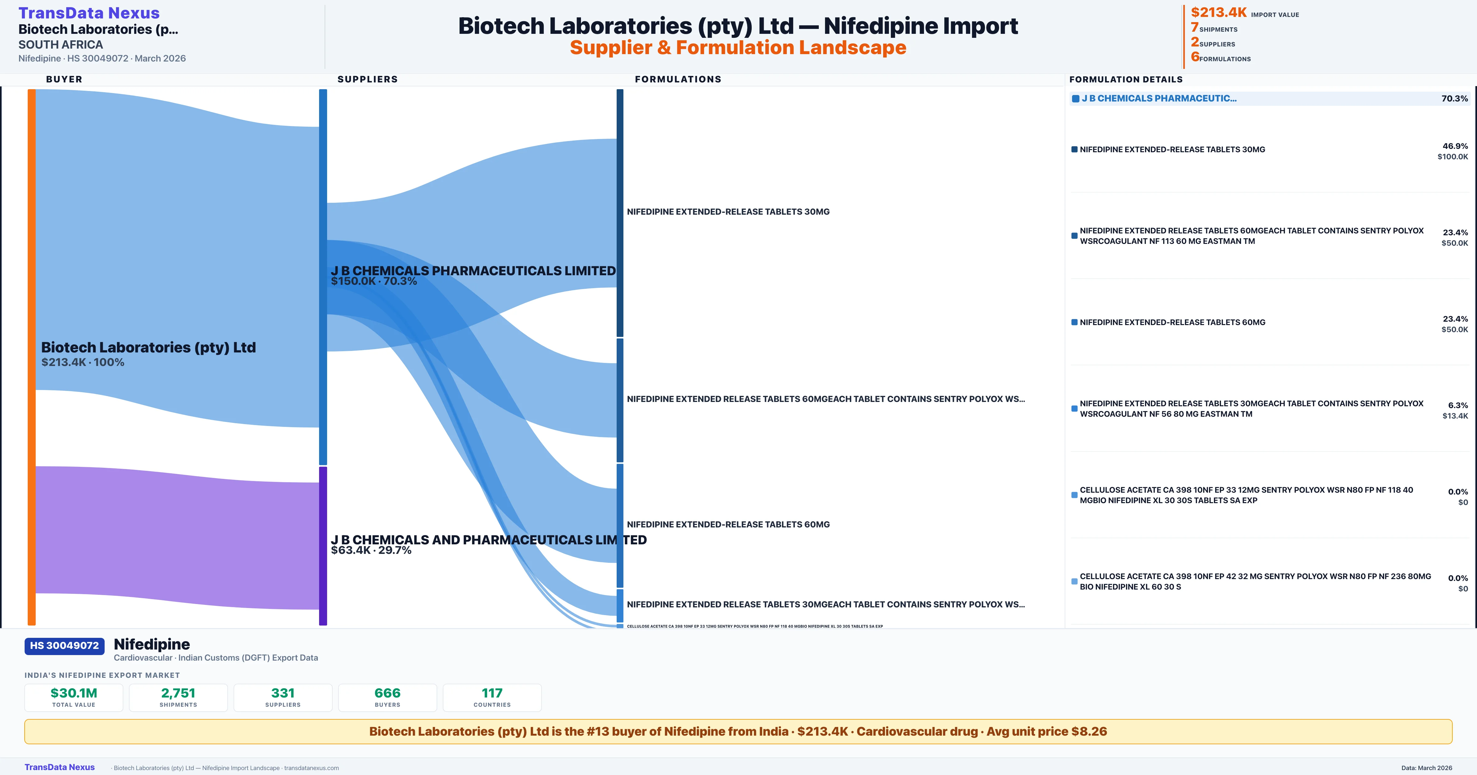 BIOTECH LABORATORIES (PTY) LTD sources Nifedipine from 2 verified Indian suppliers: J B CHEMICALS PHARMACEUTICALS LIMITED ($150.0K, 70.3%), J B CHEMICALS AND PHARMACEUTICALS LIMITED ($63.4K, 29.7%). This is based on 7 customs records.
