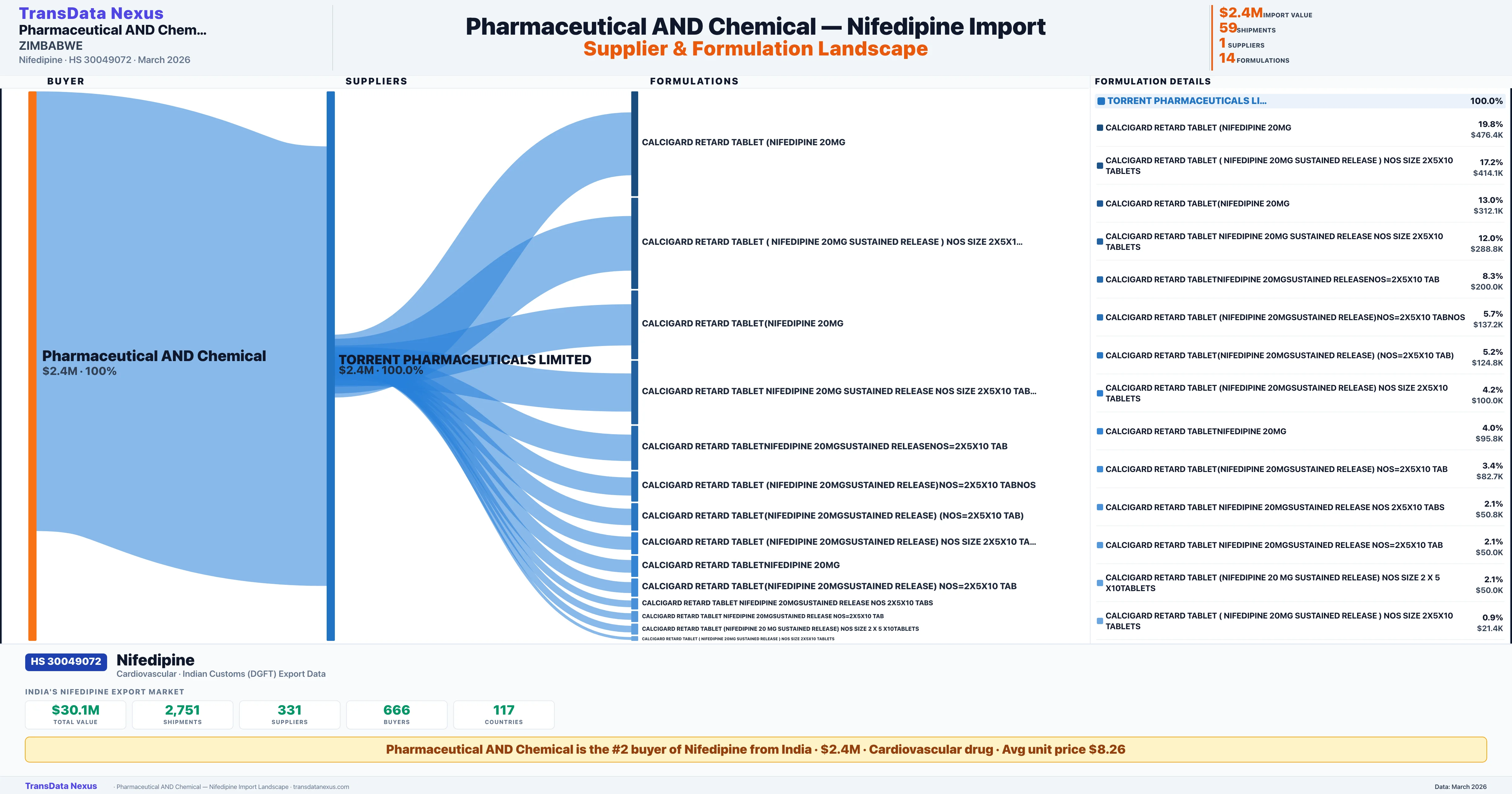 PHARMACEUTICAL AND CHEMICAL imports Nifedipine to 1 country. The primary destination is ZIMBABWE receiving 100.0% of shipments worth $2.4M.