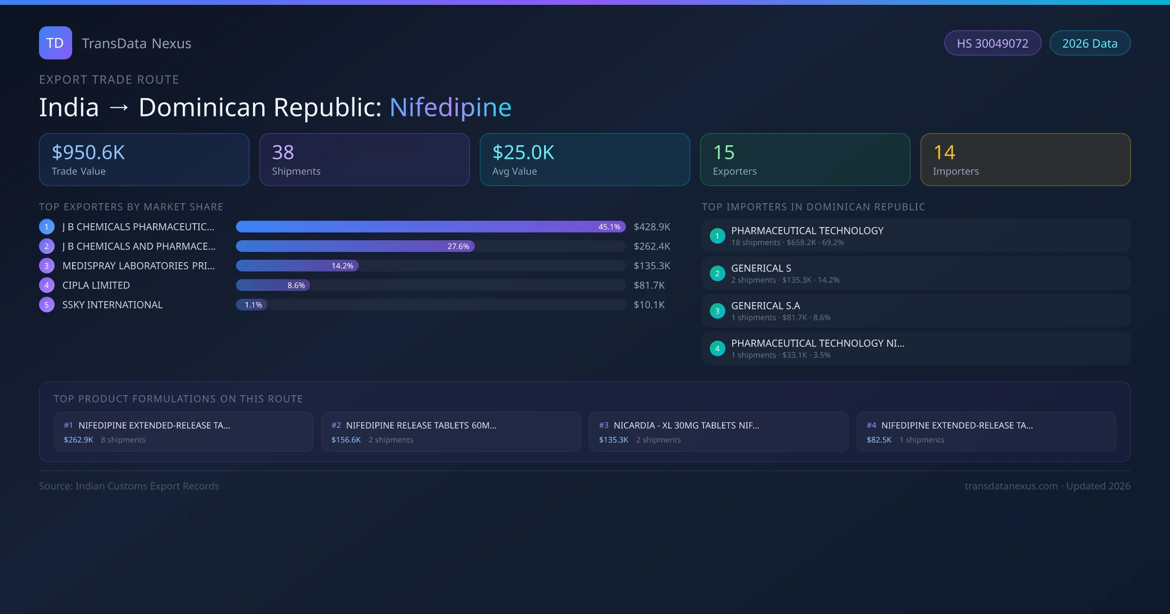 - 1.Route Identification: India to Dominican Republic export trade corridor identified from Indian Customs (DGFT) records for Nifedipine.