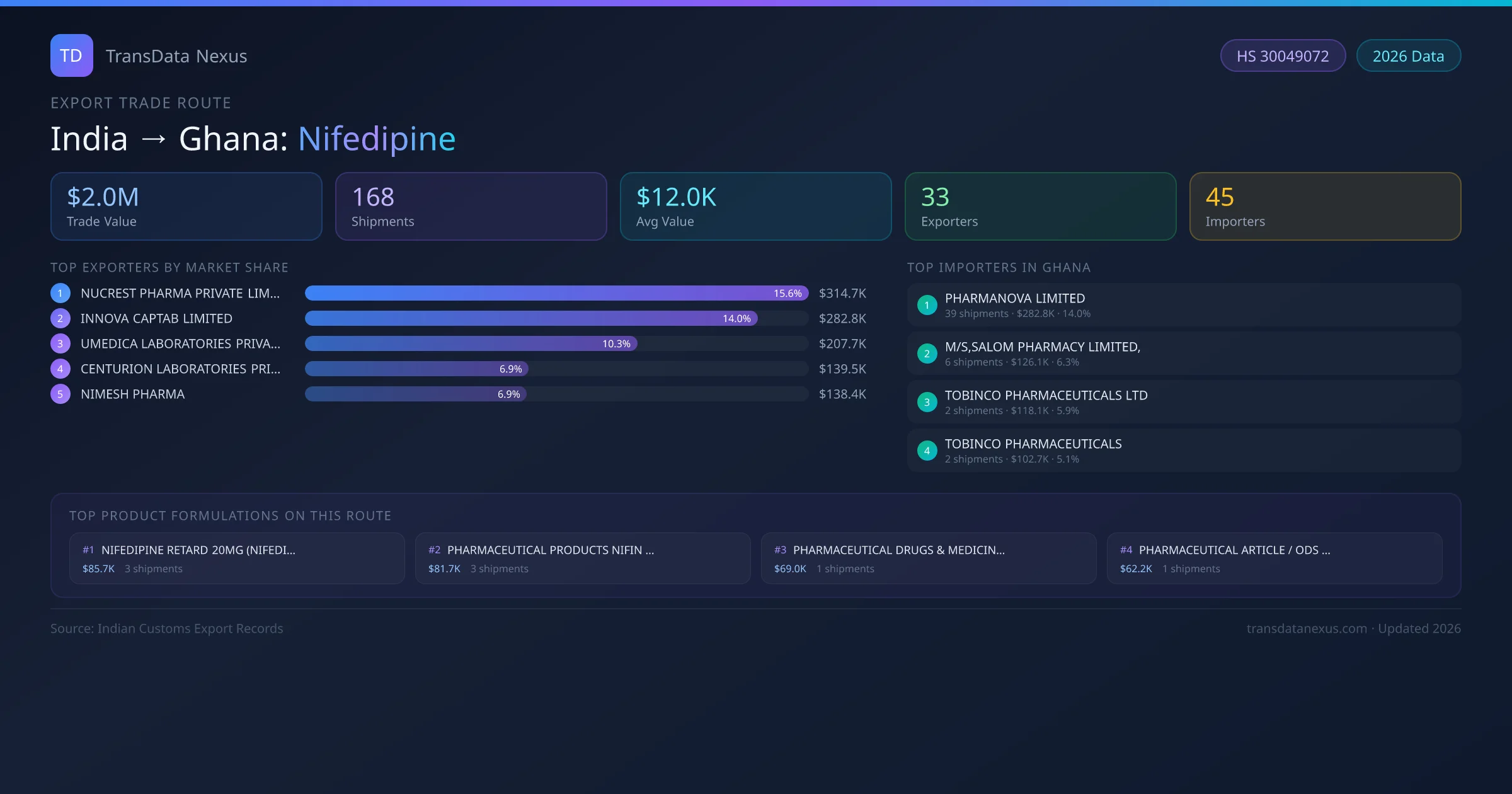 India has recorded 168 verified shipments of Nifedipine exported to Ghana, representing a combined trade value of $2.0M USD. This corridor is served by 33 active Indian exporters, with an average shipment value of $12.0K USD. The leading Indian exporter is NUCREST PHARMA PRIVATE LIMITED, which accounts for 16% of total export value with 10 shipments worth $314.7K USD. On the buying side, PHARMANOVA LIMITED is the largest importer in Ghana with $282.8K USD in purchases. The top 3 suppliers — NUCREST PHARMA PRIVATE LIMITED, INNOVA CAPTAB LIMITED, UMEDICA LABORATORIES PRIVATE LIMITED — together control 40% of total trade value on this route. All data sourced from Indian Customs (DGFT) shipping bill records. Values reported in FOB USD.