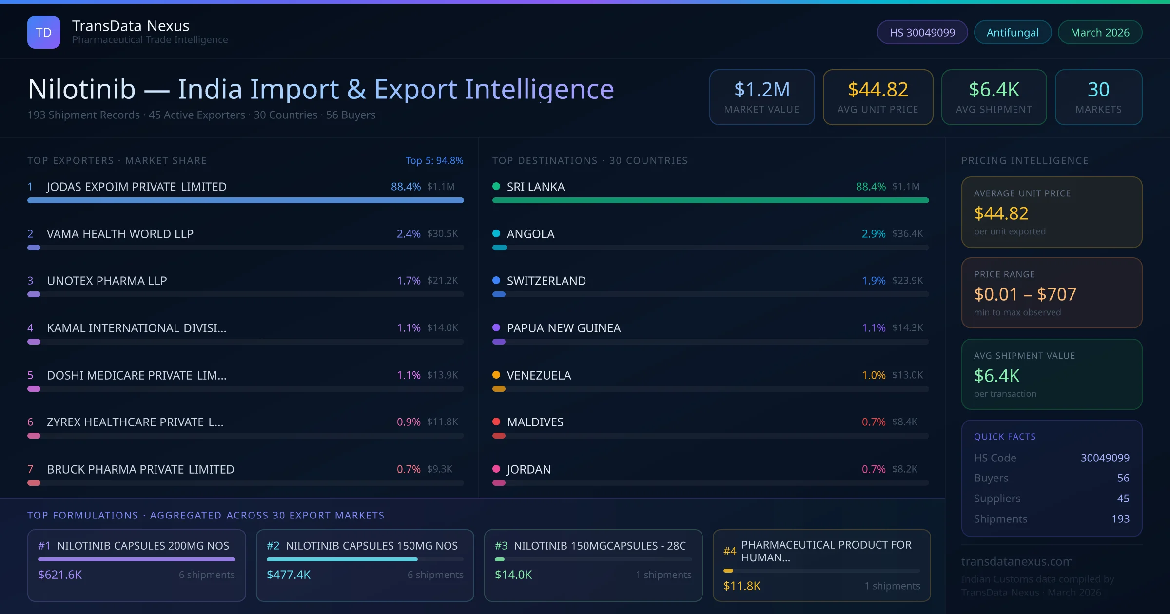The total export value of nilotinib from India is $1.2M, recorded across 193 shipments from 45 active exporters to 30 countries. The average shipment value is $6.4K.