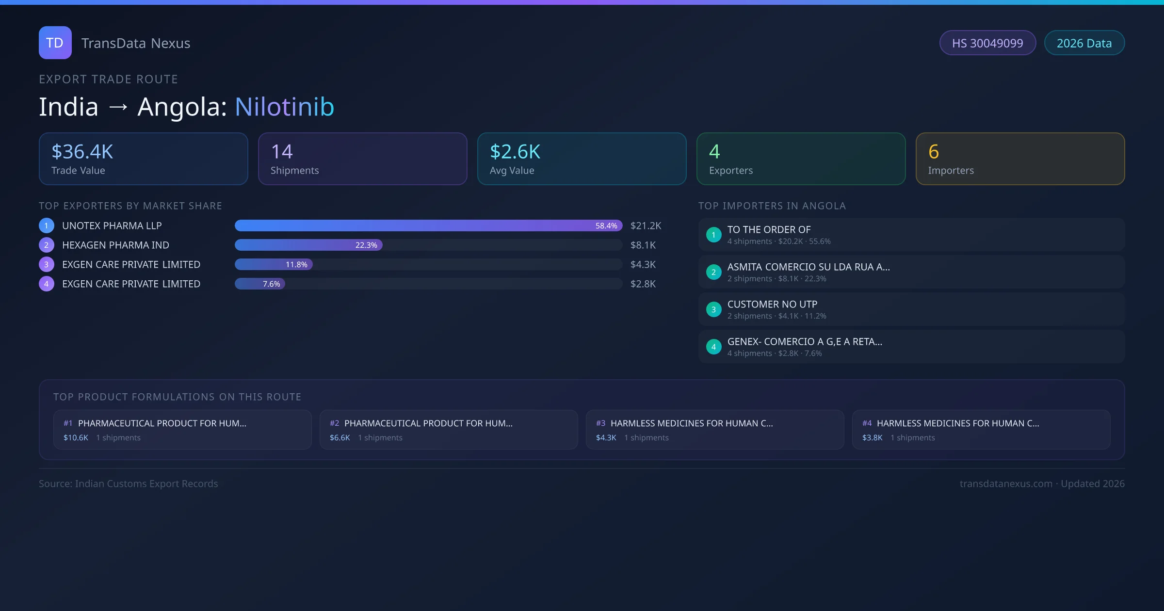- 1.Route Identification: India to Angola export trade corridor identified from Indian Customs (DGFT) records for Nilotinib.