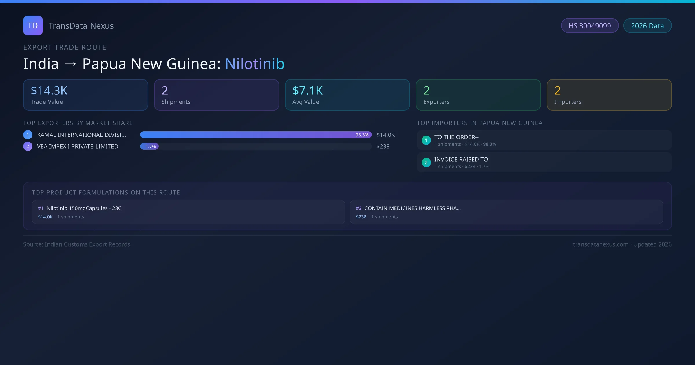 The India to Papua New Guinea Nilotinib corridor is one of India's established pharmaceutical export routes, with 2 shipments documented worth a combined $14.3K USD. The route is dominated by KAMAL INTERNATIONAL DIVISION OF GAJHAM EXPORTS PRI , which alone accounts for roughly 98% of all export value, reflecting the consolidated nature of India's nilotinib manufacturing sector.