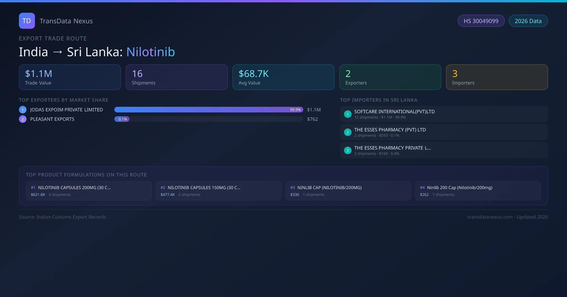 The India to Sri Lanka Nilotinib corridor is one of India's established pharmaceutical export routes, with 16 shipments documented worth a combined $1.1M USD. The route is dominated by JODAS EXPOIM PRIVATE LIMITED, which alone accounts for roughly 100% of all export value, reflecting the consolidated nature of India's nilotinib manufacturing sector.