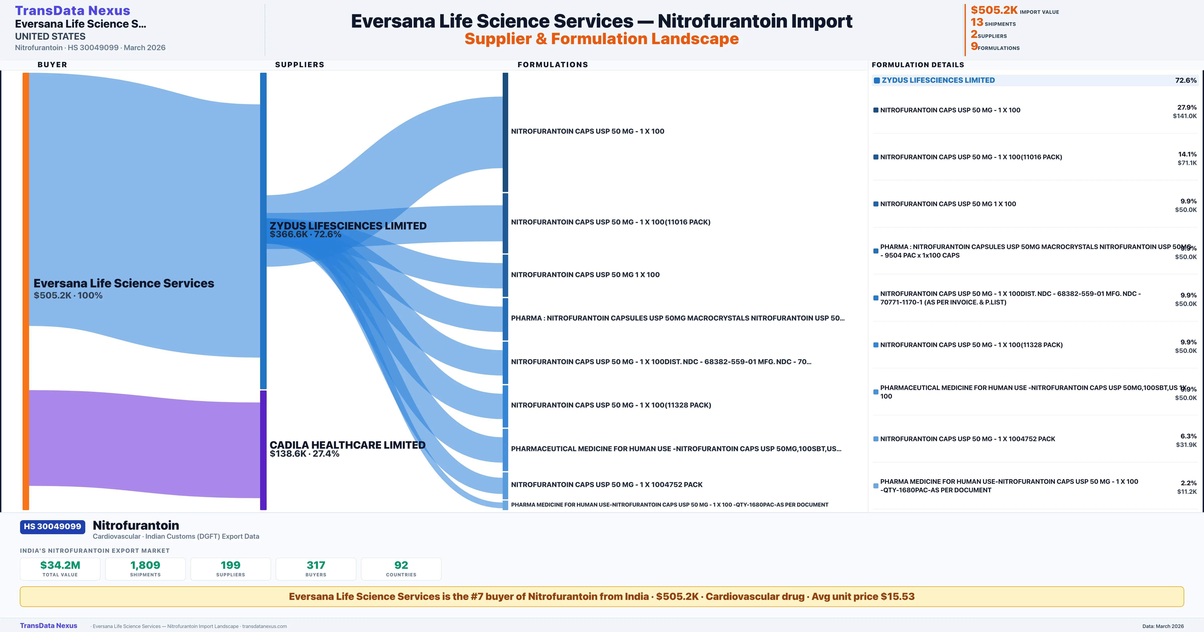 EVERSANA LIFE SCIENCE SERVICES sources Nitrofurantoin from 2 verified Indian suppliers: ZYDUS LIFESCIENCES LIMITED ($366.6K, 72.6%), CADILA HEALTHCARE LIMITED ($138.6K, 27.4%). This is based on 13 customs records.